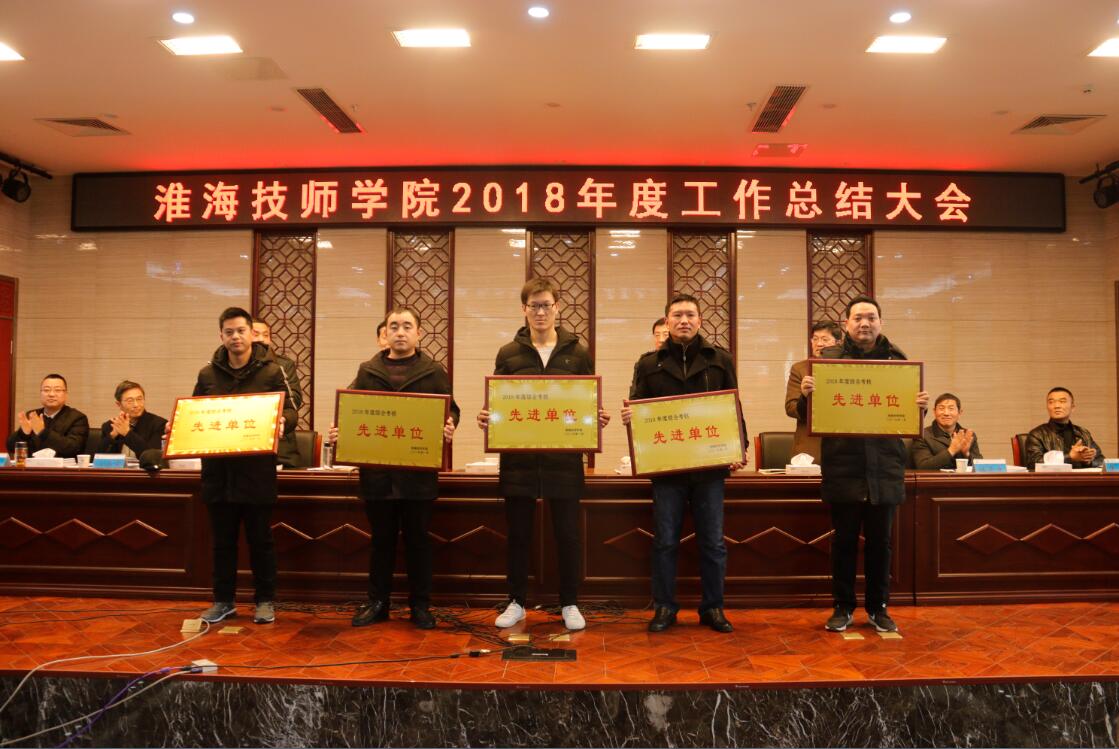随后,胡方军宣读了学院2018年度目标绩效考核先进单位和技能大赛突出贡献奖表彰文件。会议对五个先进单位和一个突出贡献单位进行了表彰,并颁发了奖牌。