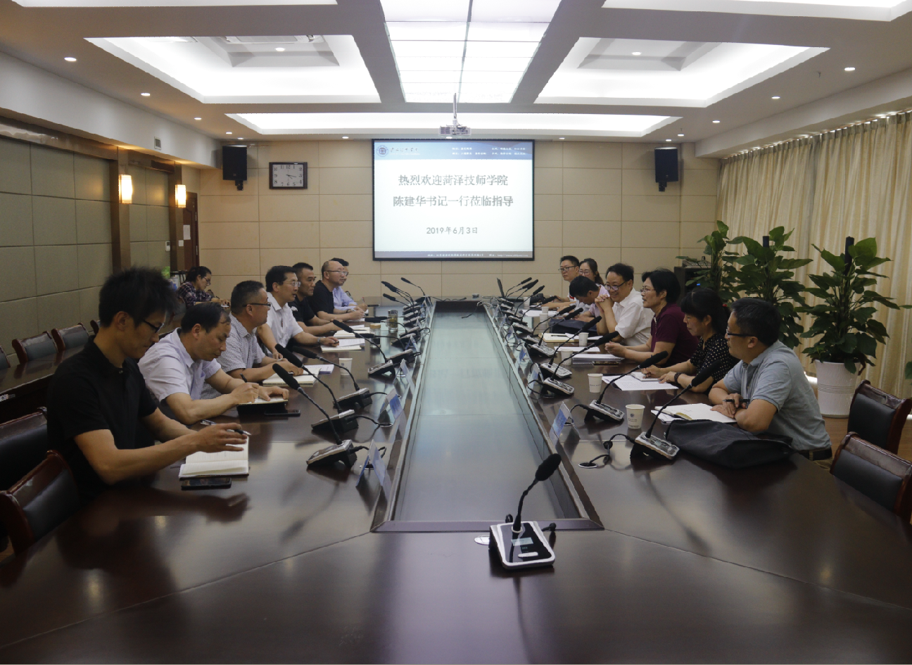 6月3日,菏泽技师学院党委书记陈建华带领相关部门负责人一行八人来我院参观交流。院党委副书记、副院长张兵营,党委委员、副院长王治,院委委员、党政办公室主任朱宇亮、培训处处长李刚及相关部门负责人参加座谈会。