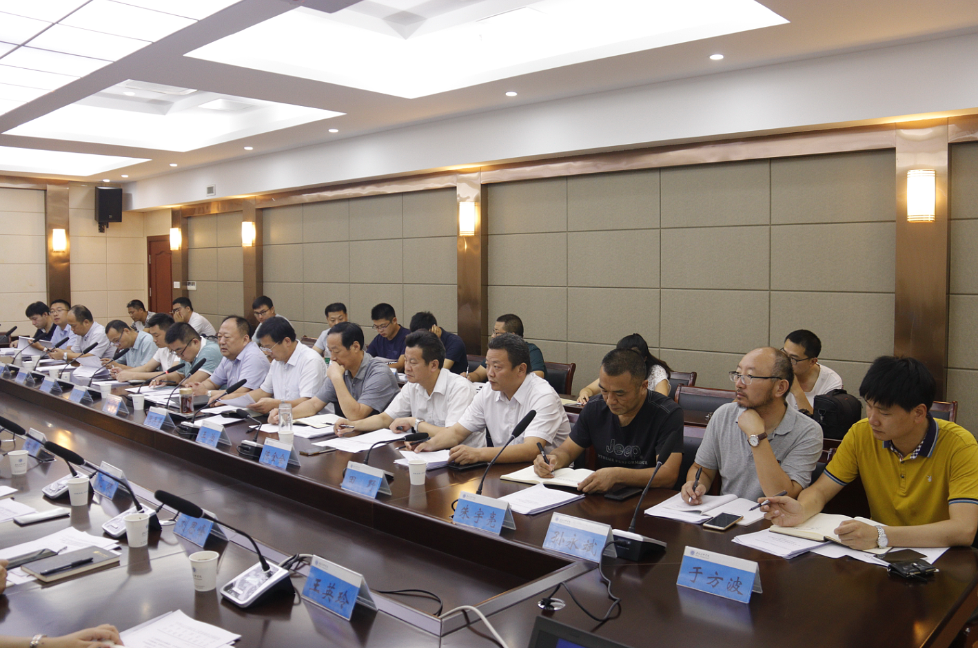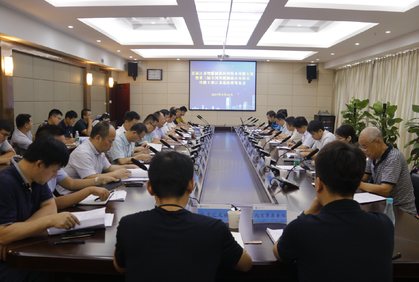 为加快培养我省智能制造领域高素质技能人才,推动产业加速发展,做好我省2019年中国技能大赛——第三届全国智能制造应用技术技能大赛参赛选手的选拔、推荐工作,省人社厅、省总工会定于9月中旬在我院举办首届江苏智能制造应用技术技能大赛暨第三届全国智能制造应用技术技能大赛江苏选拔赛。为做好大赛组织和技术保障工作,8月16日,省人社厅职业能力建设处调研员陈彦德率相关负责人、专家及技术支持企业代表到我院召开大赛筹备会,协调大赛有关事项,现场指导大赛的具体筹备工作。宿迁市人社局党组成员、市考试鉴定中心主任张永生,学院党委副书记、副院长张兵营,院党委委员、副院长王治,市人社局职业能力建设处处长陈金全及相关部门负责人参加会议。
