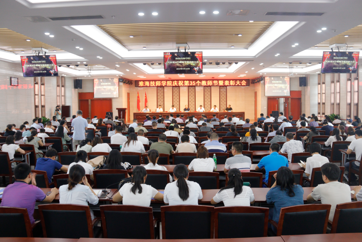 为庆祝第35个教师节,表彰在教学、科研、管理和服务工作等方面涌现出来的楷模,9月10日下午,我院在行知楼十二楼报告厅举行“庆祝第35个教师节暨表彰大会”。市人社局党组成员、市考试鉴定中心主任张永生,学院领导班子全体成员出席会议。院党委副书记、副院长张兵营主持会议,全体教职工参加会议。