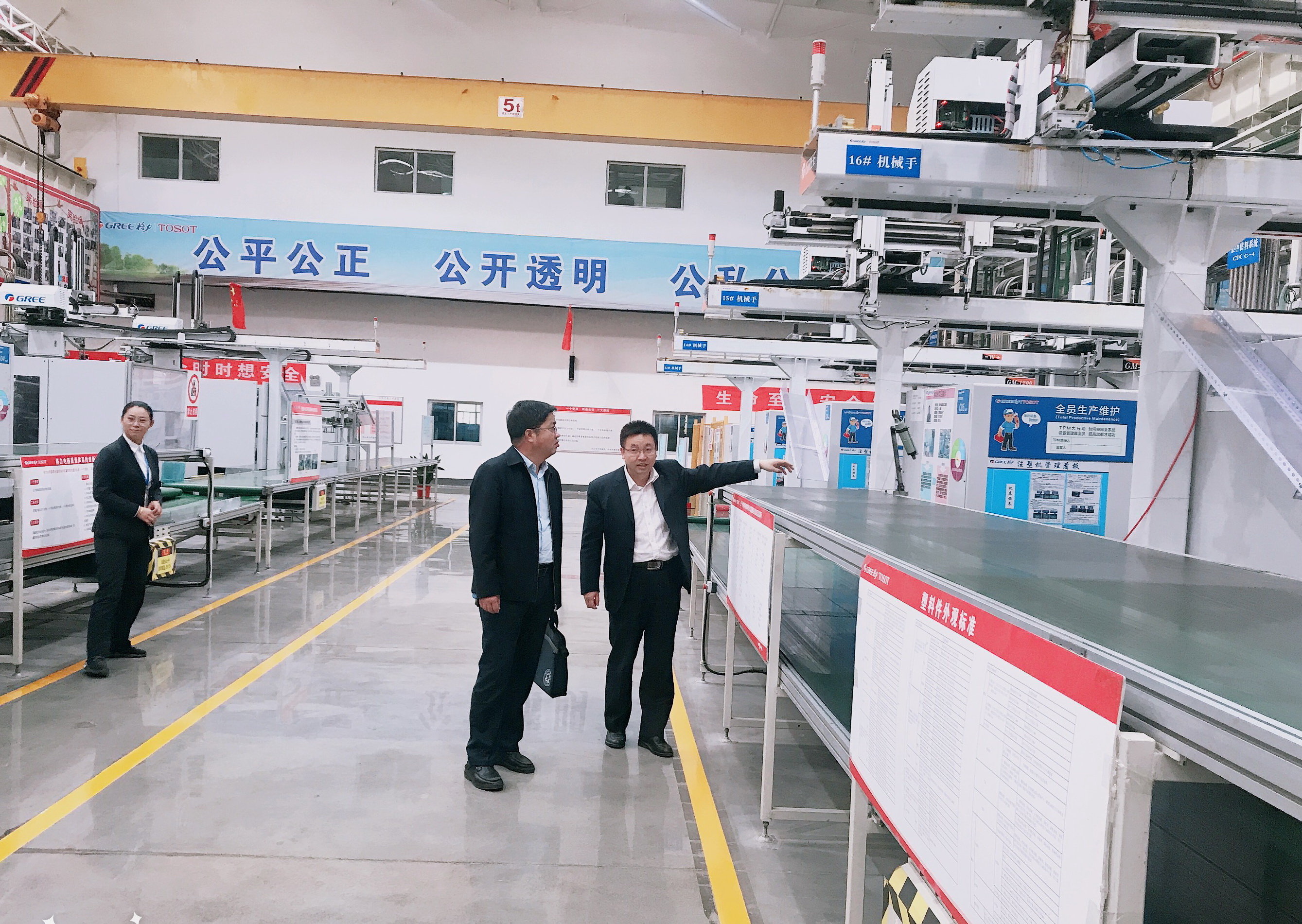 胡方军一行首先参观了格力生产车间和检测实验室。他表示,淮海技师学院和格力大松电器一直在深入开展校企合作,对企业给予学院的大力支持表示感谢,期望格力与学院能在科研、技术成果转化、技能人才培养上进行更加深层次的合作。