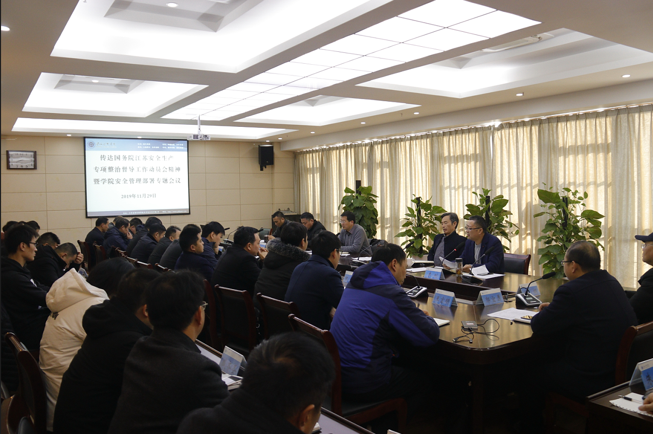 11月29日,院党委副书记、副院长张兵营(主持工作)主持召开专题会议,传达学习国务院江苏安全生产专项整治督导工作动员会精神,对做好当前和下阶段安全隐患排查整治工作进行再强调、再落实。院领导班子成员、各部门负责人及科长参加会议。
