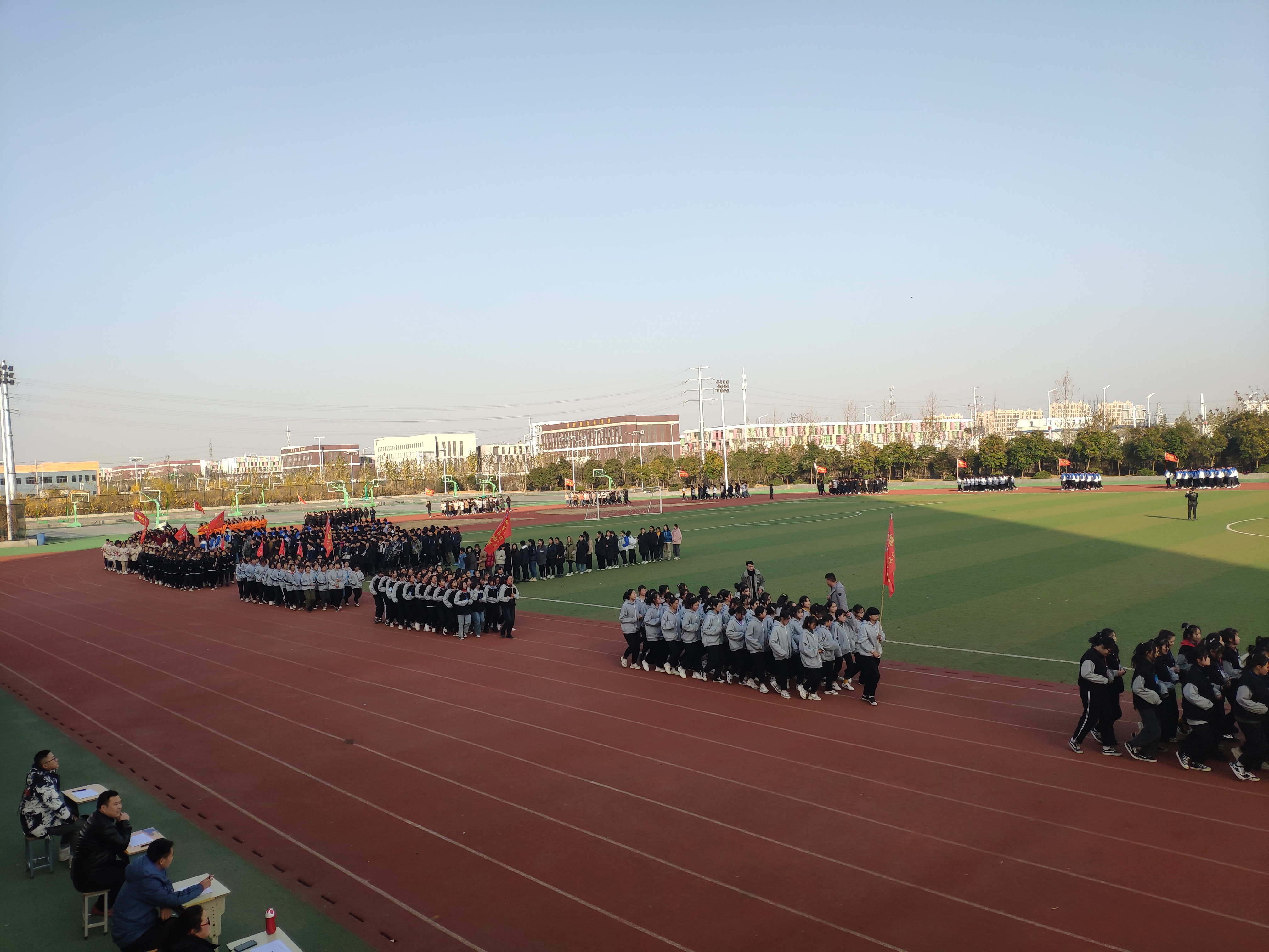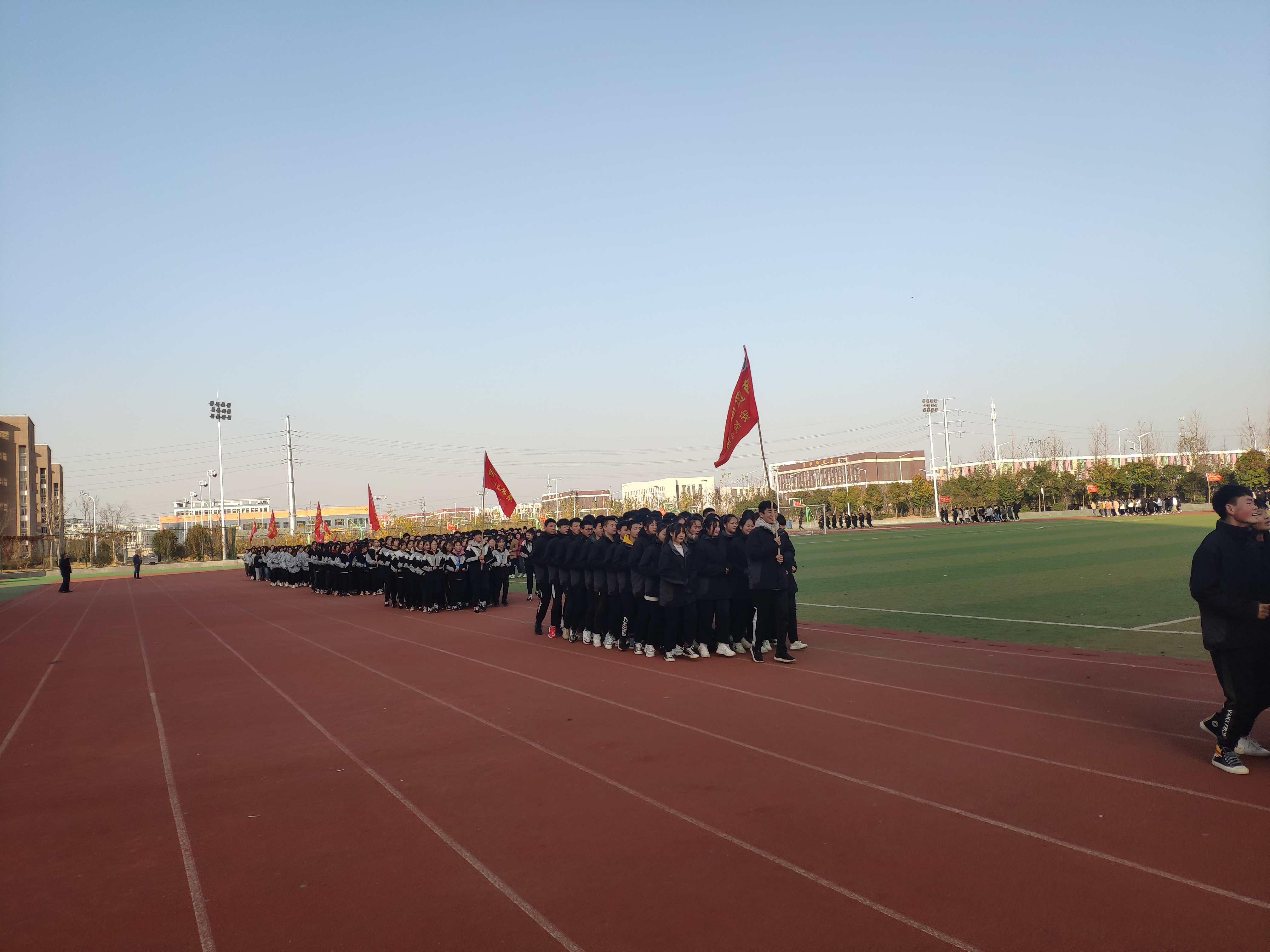比赛共分两个部分进行,分别为集体展示和优秀班级决赛。虽然寒风凛冽,但广大师生群情激昂,不畏严寒,充分展示出了奋勇拼搏、永争第一的精神。运动场上,同学们在各班班旗的指引下,意气风发、斗志昂扬,喊着响亮的号令,迈着整齐的步伐,谱写着在校园文化建设中师生同心、坚定意志、顽强拼搏、共创辉煌的美好诗篇。