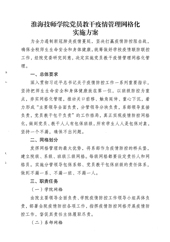 充分发挥党组织的政治优势、组织优势,全院建立起横向到边、纵向到底的院级、系级、班级三级网格防控体系,每级网格都设定责任人和网格员,实施分管领导包保系部、党员教干包保班级的责任体系。