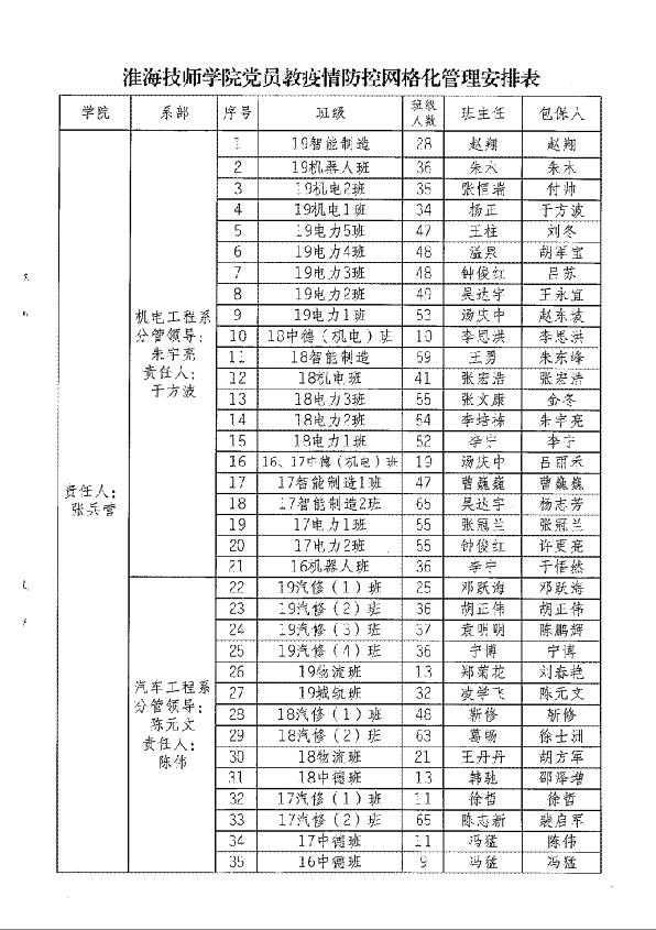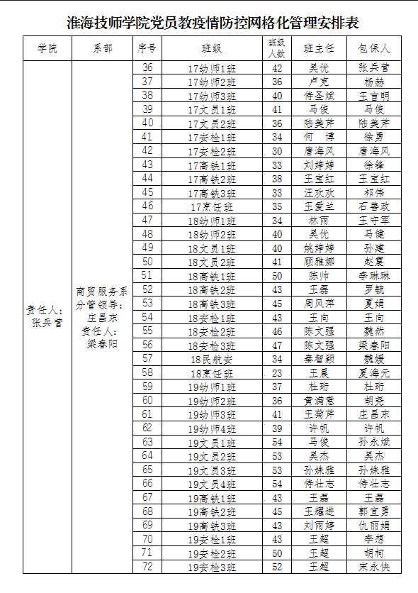 为充分发挥基层党组织作用,学院组建了“院领导+系领导+支部书记,党员+教干+班主任”的“六位一体”防控队伍,以班级防控为重点,夯实网格化管理,推动关口前移、触角延伸、重心下沉,着力形成“主要领导全面负责,分管领导分块负责,系部领导直接负责,党员教干包干负责”的工作格局,真正实现疫情防控网格化,做到党员、教干人人有包保班级。目前,学院107名党员教干人人参与,8036名学生人人是包保对象,坚持一个不漏,确保不出问题。