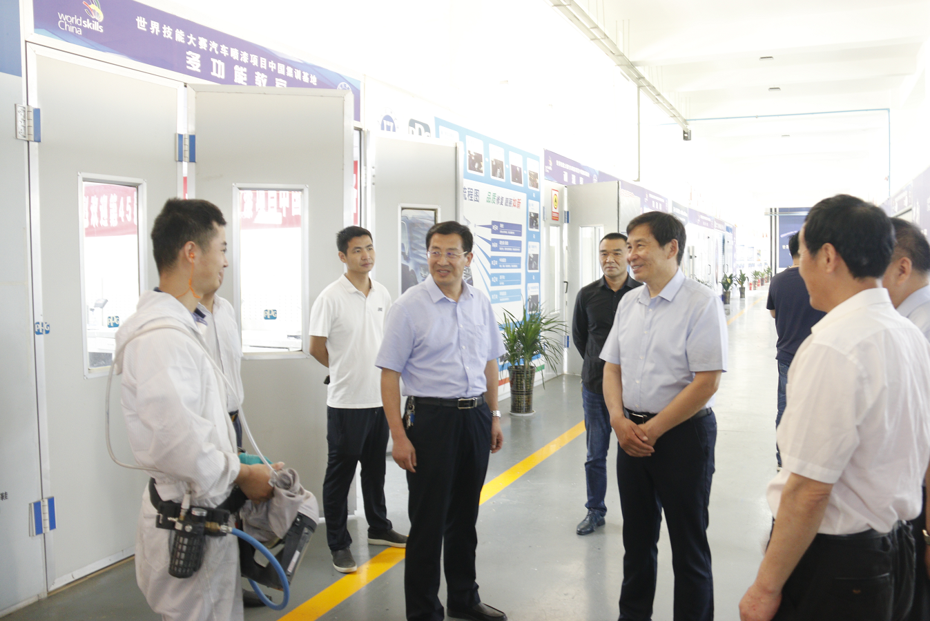 孙登怀一行实地考察了学院复学防疫工作落实情况,先后参观了学院学生餐厅、高铁乘务实训中心、数控加工实训中心、机械加工实训中心、安全考核基地、汽车喷漆国赛集训基地、声乐实训中心、机器人实训中心等地,看望慰问了世界技能大赛等项目集训选手,鼓励他们积极备战,再创佳绩。