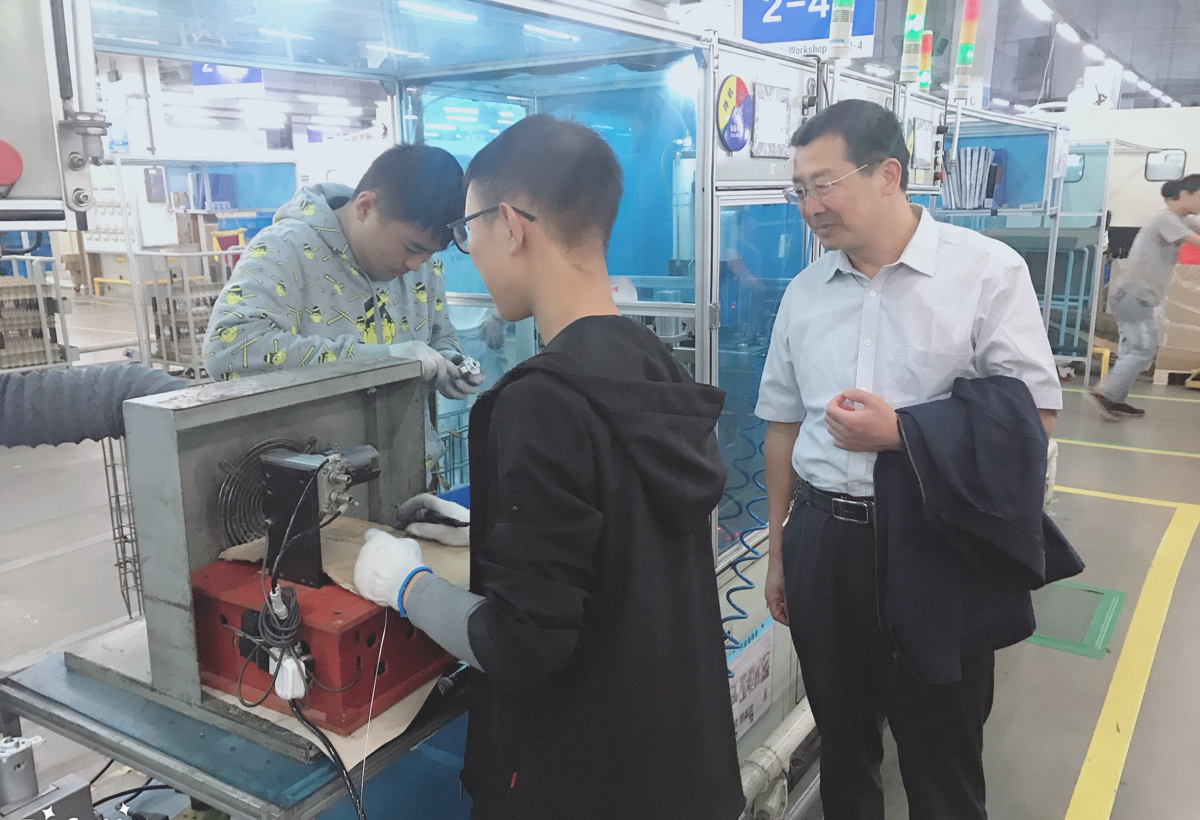 张兵营一行首先参观了企业生产制造基地,向企业详细了解了学生在企业的学习生活情况,认真查看了《工学交替实习任务书》,并与在岗学生亲切交流。看到学生逐步成长为企业有用之才,实现学生到员工的角色快速转变,对学生在企业的学习生活感到满意。学生在企业见到“娘家人”倍感亲切,纷纷表示将认真完成学习和工作任务。