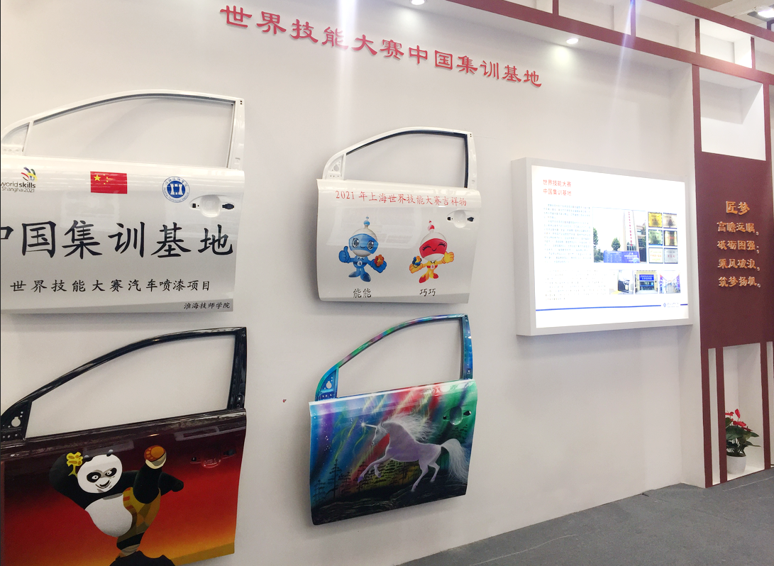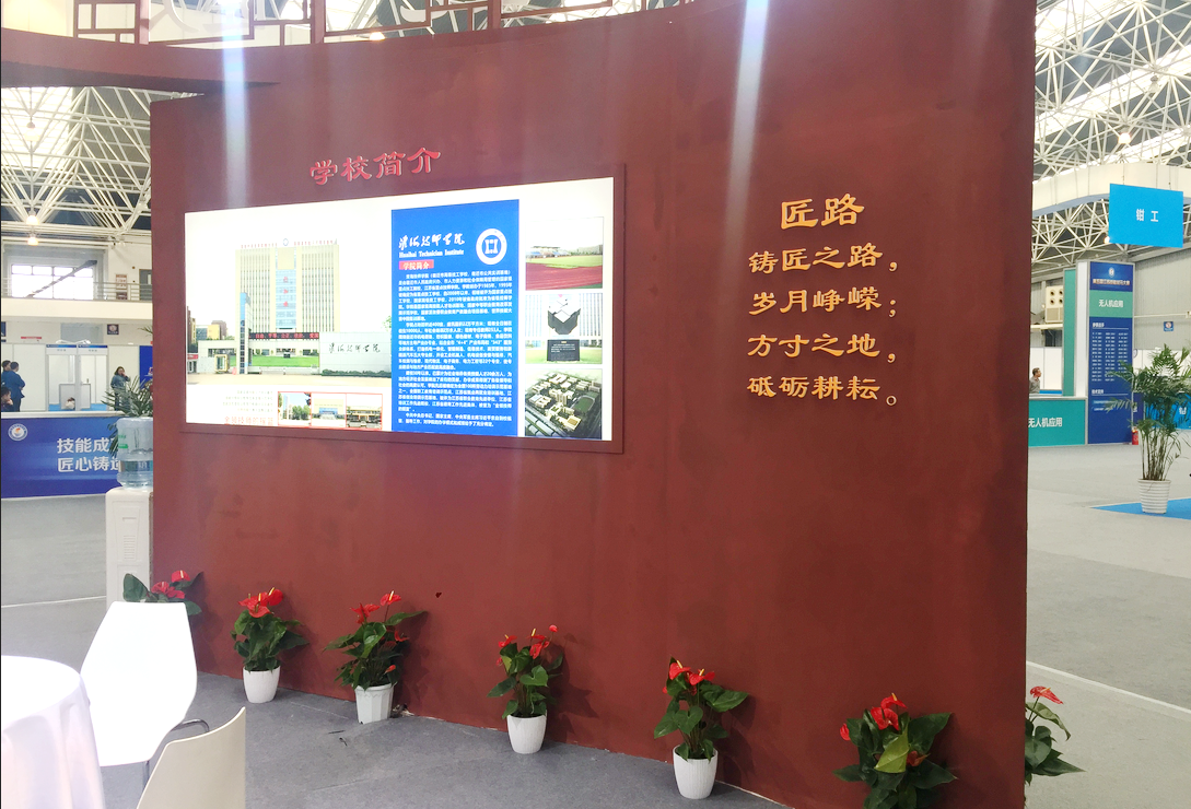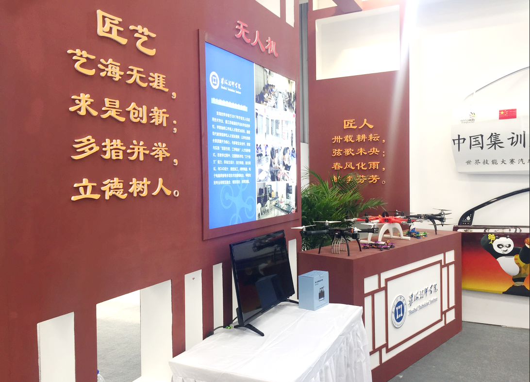 在展会现场,我院精心制作了以“匠路、匠心、匠艺、匠人、匠梦”为主线的办学成果展示模块,通过学生制作作品实物陈列、图文并茂的展板介绍、传承人的现场技艺操作表演、互动体验等形式进行展示。有学院办学成果图文展示,有烙画和泥塑两个经典产业特色专业现场制作技艺展示,有世界技能大赛中国集训基地学生喷漆作品展示,有学生制作组装无人机及模拟飞行展示,有视频播放学院宣传片展示等。