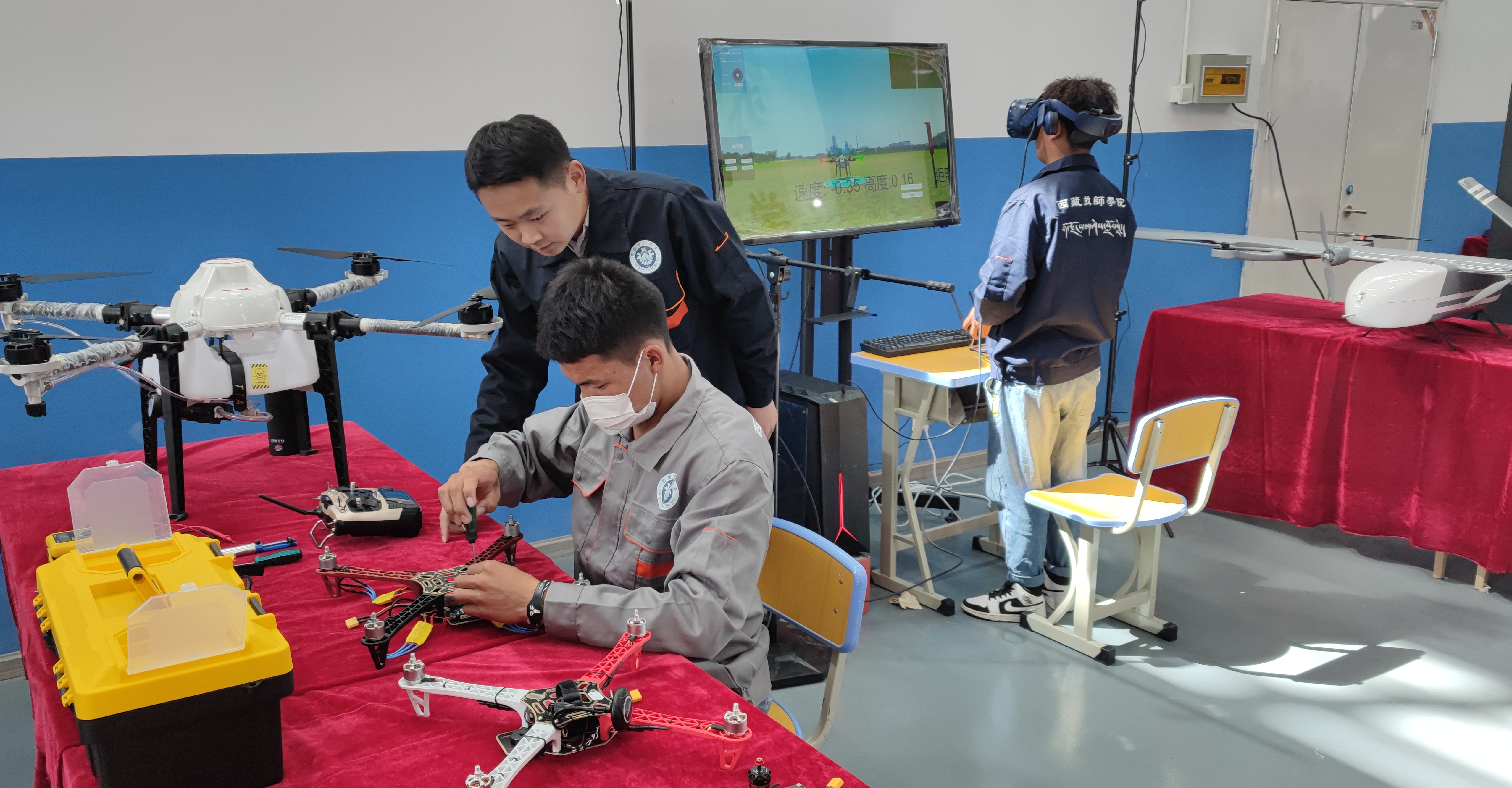 张文康老师到西藏技师学院支教已经过去半年,在这段时间,他快速熟悉了当地风土人情,以自身的专业优势,在当地开展行业调研,制定了无人机应用技术专业实训室布局以及所需设备清单,根据多家合作企业意见以及本地实训需求,合理划分实训室功能,目前1间无人机模拟飞行实训室和1间无人机装调实训室已经建设完成,1个无人机专用飞行训练场地正在建设中。同时,积极指导培养1名青年教师专业成长,并根据该院的生源情况和教学条件编写了无人机应用技术专业人才培养方案,依据人才培养方案编制了3个学年全部的课程计划和课程标准。在日常教学中,他以最简单易懂的方式进行讲解授课,让学生理解到书本中的重点,并以小组讨论、情景模拟、示范操作等多种形式,让学生在课堂上尽量都动起来——动口、动手、动脑,调动他们的积极性,首批21名专业学生已经能够熟练地进行模拟飞行。