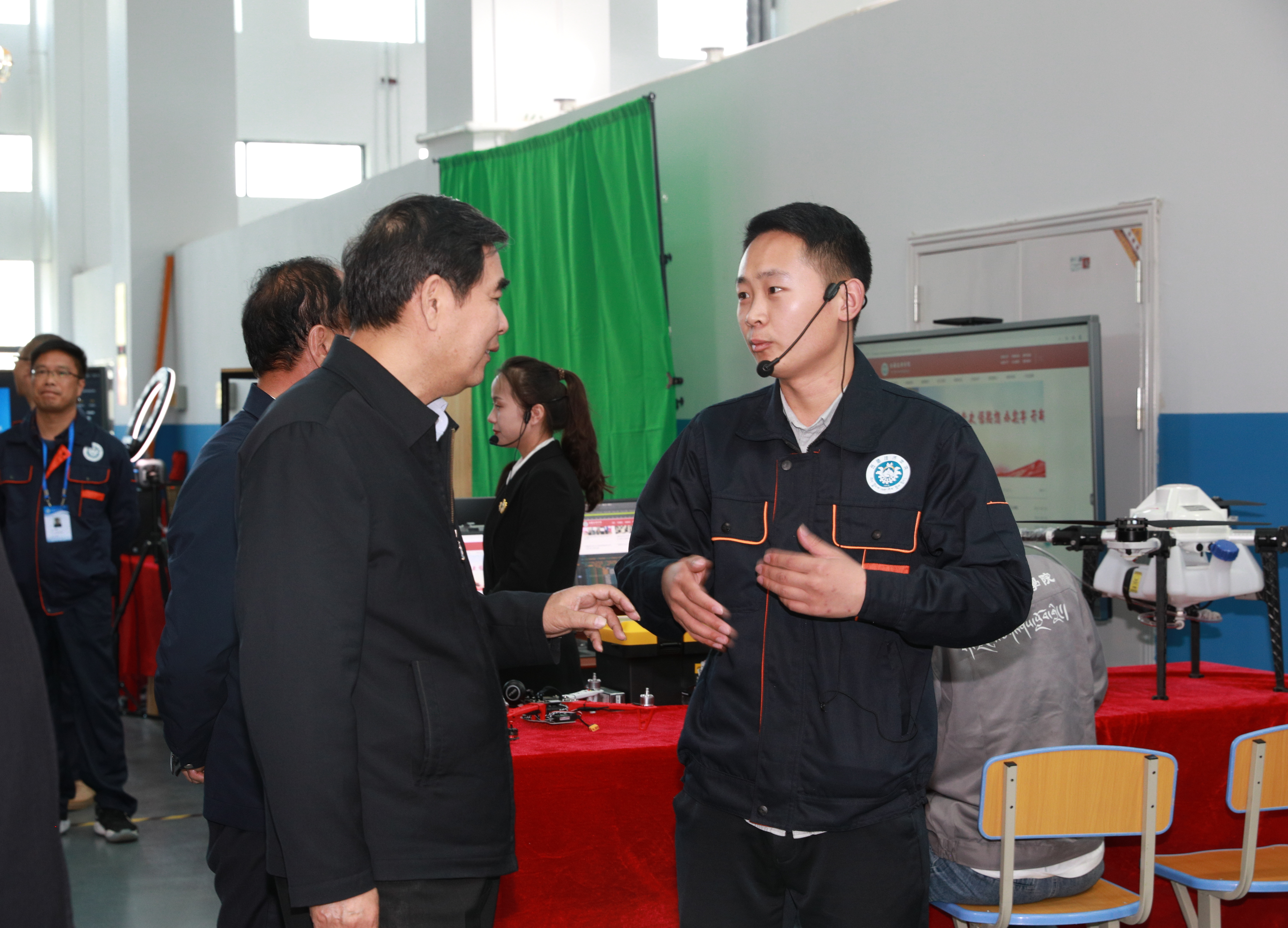 张纪南一行来到无人机实训室,与正在进行无人机组装演示教学的张文康老师亲切交谈。“来自哪个省哪个学校啊?” “在西藏的生活是否习惯,生活上是否有什么困难?”。张部长嘘寒问暖,询问了解他的身体状况,了解他与当地教师、学生、家长、群众的沟通交流情况,了解他工作之余的生活、学习情况。提醒他注意饮食、注意休息,加强锻炼,确保身体健康。同时,鼓励他积极进取,加强学习,把西藏技师学院的专业建设好。
