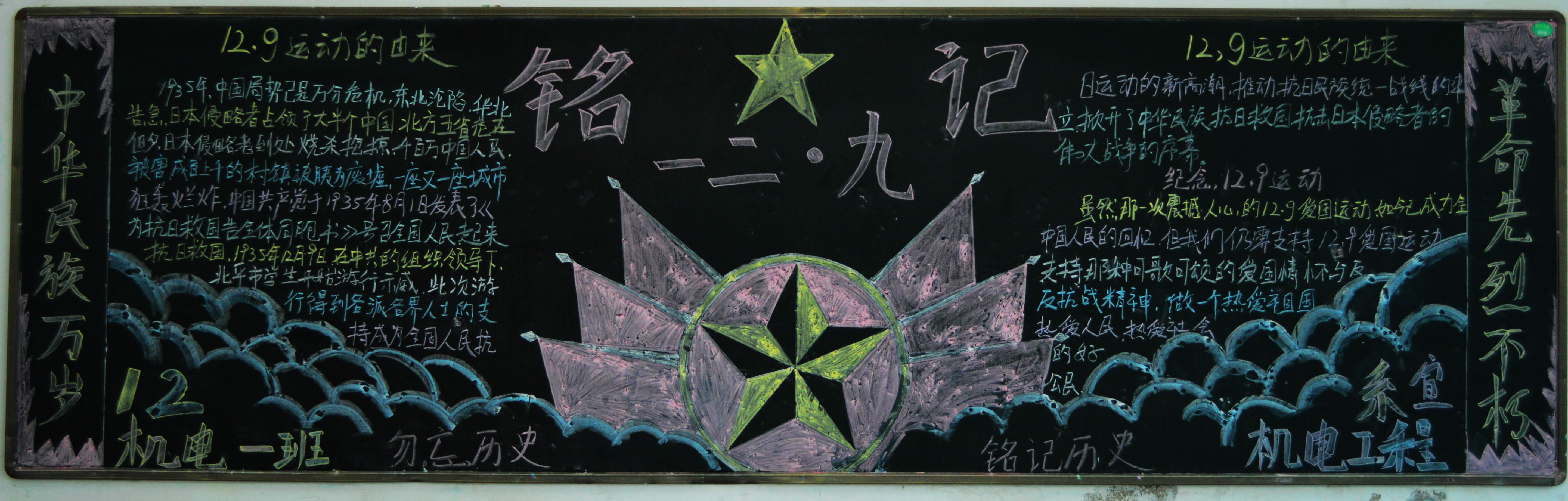 为了缅怀历史,传递爱国正能量,激发同学们的爱国热情。引导广大学生积极向上的进取精神,不虚度光阴,让生活更加有意义,特在全系范围内开展“纪念一二•九运动”主题黑板报比赛活动。经前期宣传共9个班级参加,经教师、学生匿名评审,依据布局合理、主题突出、色彩协调、文字工整等指标,此次活动收到了良好的效果,不仅使广大同学树立了“勿忘国耻,奋发图强”的爱国主义精神,而且也有利于使他们形成积极向上的世界观和人生观。铭记历史,展望未来,相信同学们定会继承先辈们的光荣传统,努力提升自己,好好学习,为祖国的建设作出应有的贡献。