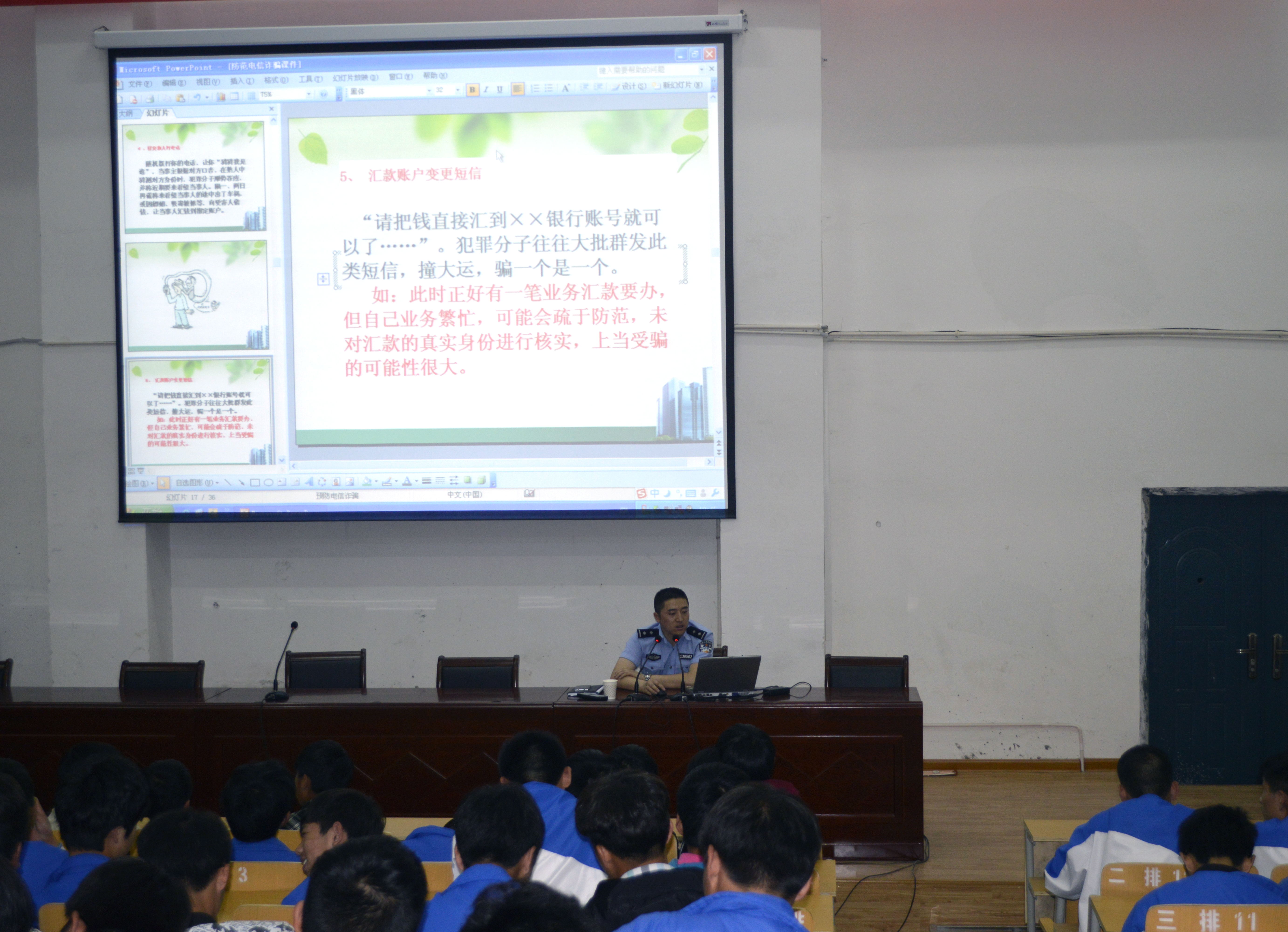 钱警官详细讲解了常见电信网络诈骗类型:新生儿补贴、冒充法院通知领取传票、退税、冒充熟人打电话、账户变更短信、无担保贷款、QQ盗号贷款、虚假中奖、编造意外事故、网络和电话交友、涉嫌洗钱犯罪、电话响一两声挂断、包裹藏毒等13类。最后,钱警官提醒大家做到“三不一要”,即不透露、不轻信、不转帐、要及时报案。