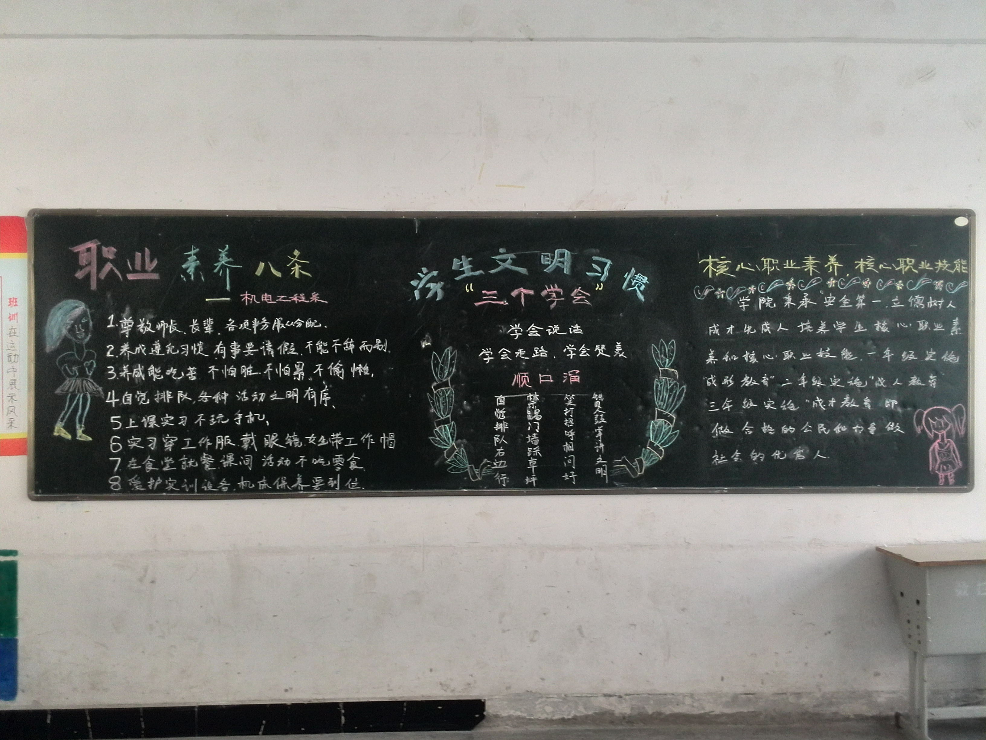 按照学院“安全第一、立德树人、成才先成人”的育人理念的精神,机电工程系各班级在班主任的辛勤劳作下都能够积极行动,统一行动抢占制高点,利用黑板报、悬挂手机袋、主题班会等形式加强学习、倡导、教育,努力打造“四成”育人目标,为学院着力培养“核心职业素养”和“核心职业技能”的淮海学子。