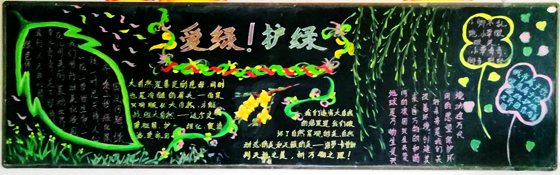 各班同学利用课余时间,围绕主题,搜集植树绿化的相关知识,精心设计版面,把自己眼中美好的绿色世界、绿色家园用手中的粉笔淋漓尽致、生动形象地展现出来。此次评比活动的评委团是由各班班长组成。在一个个书画小能手的粉笔中,教室里瞬时精彩起来。面对一幅幅精美板报,推举出的学生代表们在投票时纷纷表示难以抉择。