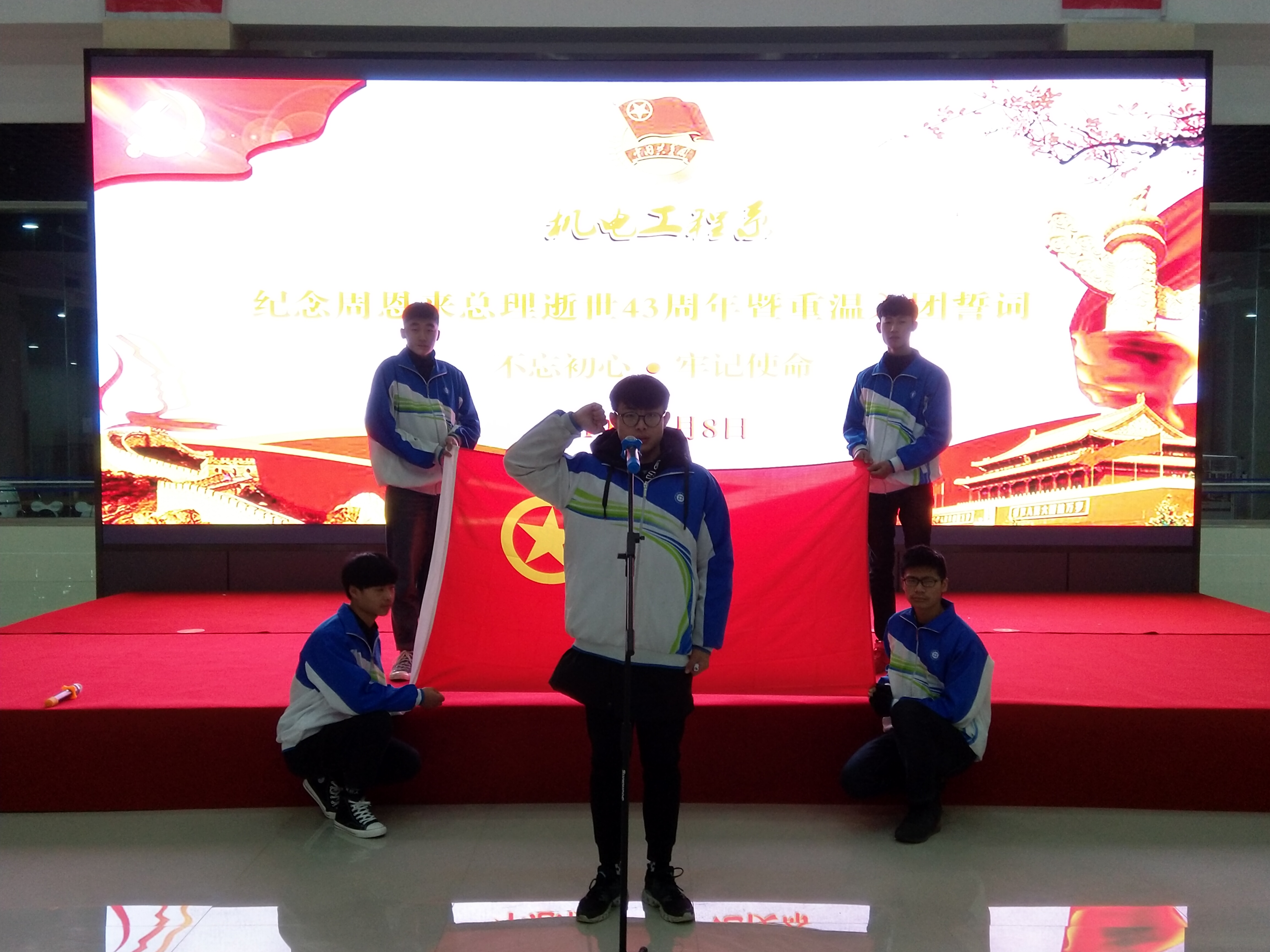 1月8日,是周恩来总理逝世43周年纪念日。为悼念革命先烈,缅怀先烈的丰功伟绩,教育学生继承革命先烈的光荣传统,弘扬民族精神,继承先烈遗志,进一步加强团员的爱国观念,机电工程系团总支组织全系团员开展了“不忘初心 牢记使命”重温入团誓词活动。