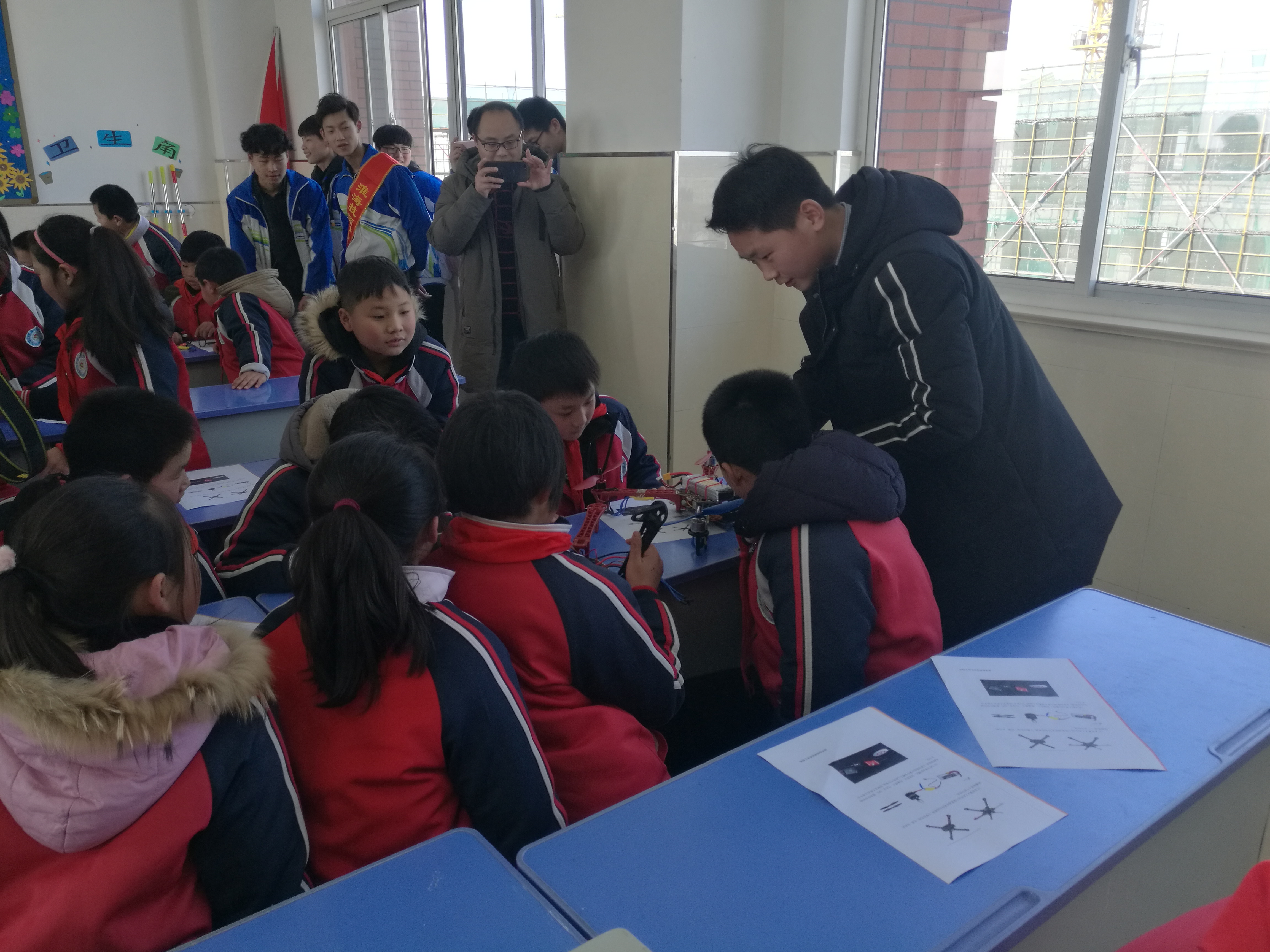 讲座开始前,我院师生给现场的每一位小学生发放了一个无人机组装零件,让同学们仔细观察。随后,专业老师从无人机飞行的原理、无人机的相关构造、飞行安全知识等方面为学生们做了深入细致的讲解。讲解风趣幽默,同学们时不时跟着老师一起动手组装。