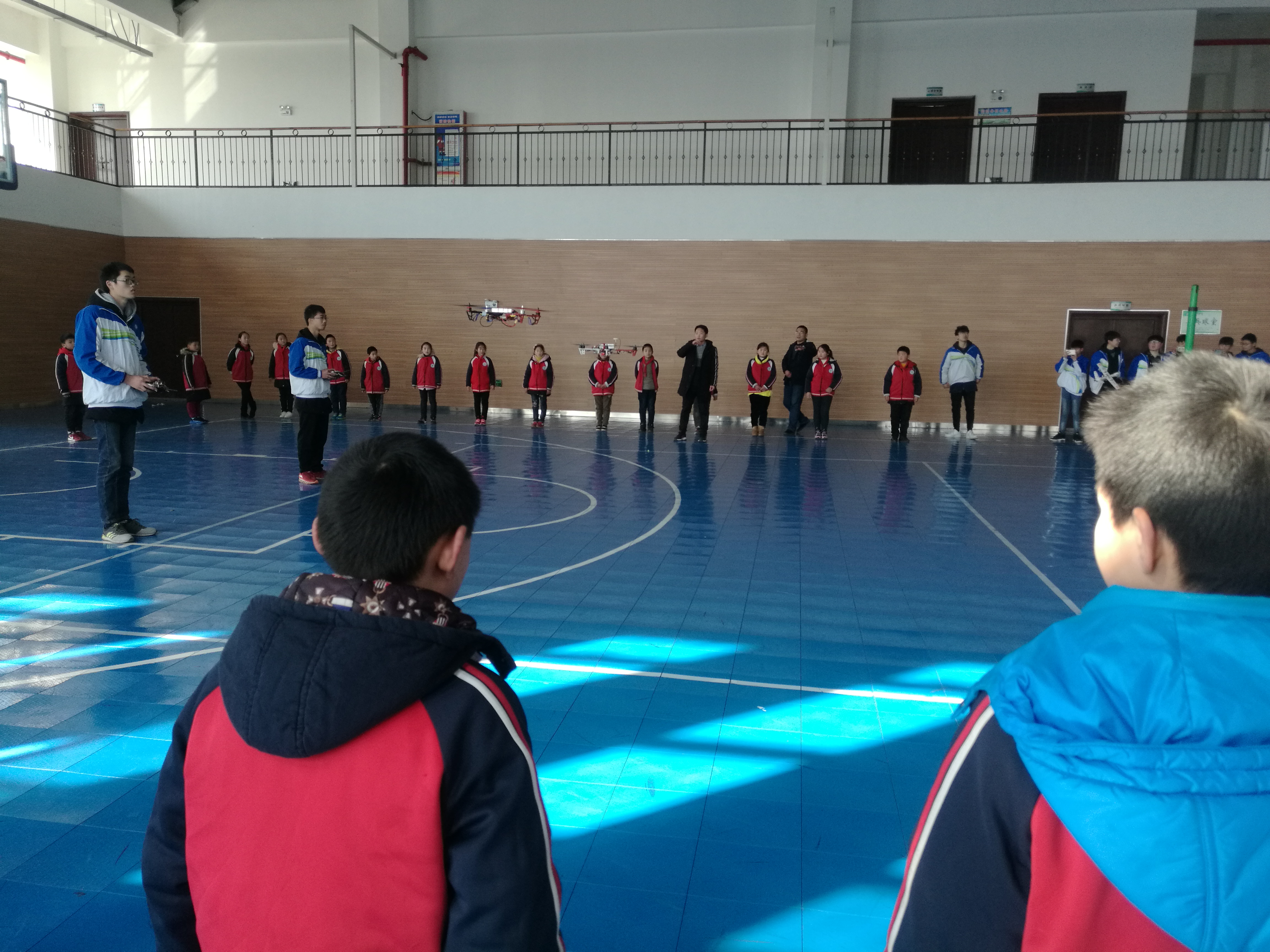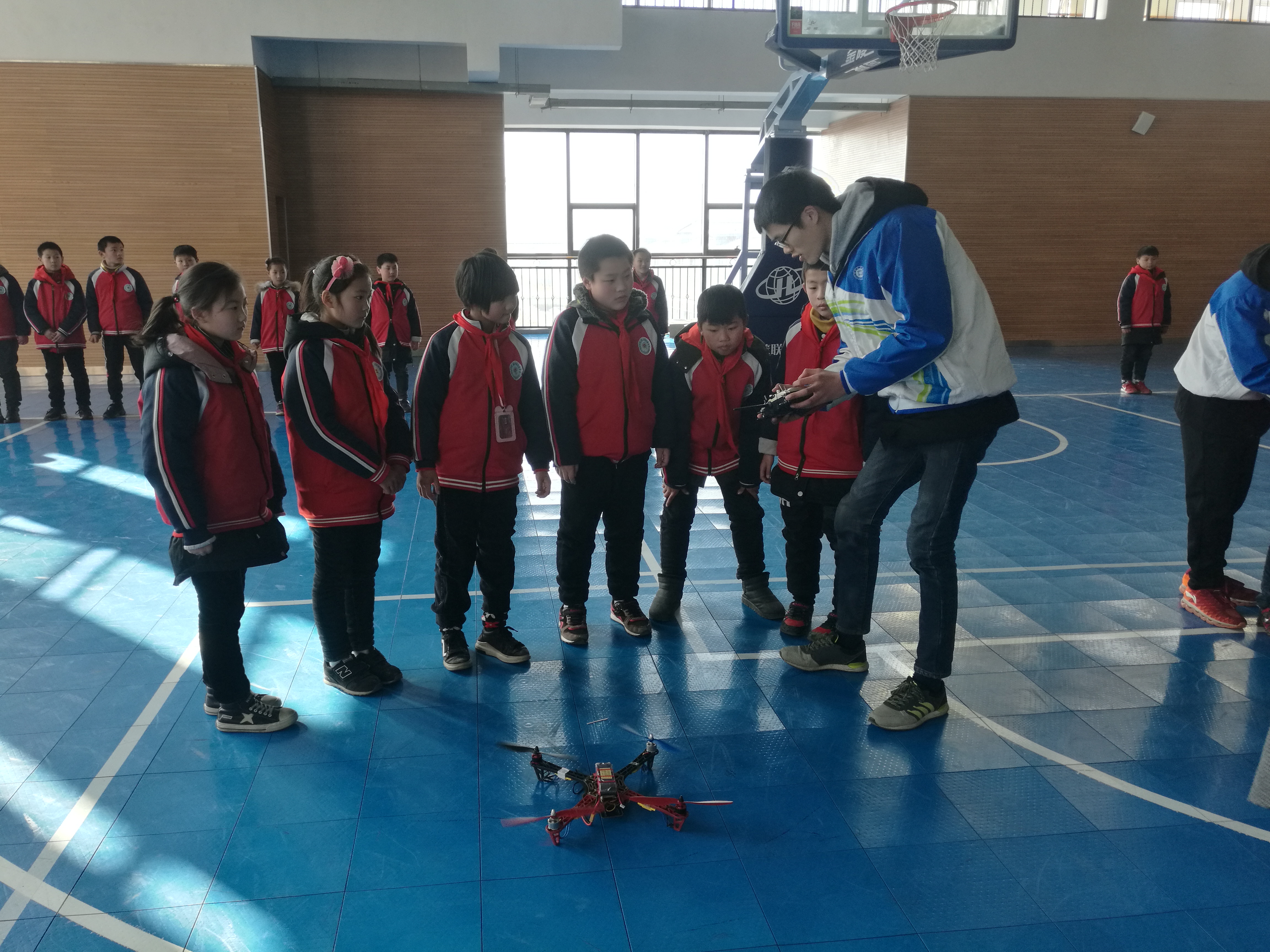 讲座结束后,小学生们在学校室内篮球场里观看了无人机应用技术专业学生们带来的无人机飞行表演。精湛的飞行动作,给小学生们带来了极大的震撼和视觉满足,欢呼声、喝彩声此起彼伏。最后,我院无人机应用技术专业学生还现场指导了8位小学生亲自操控无人机,小学生们在专业学生的指导下,体验了无人机的飞行方法,感受了无人机的飞行过程,个个都显得非常激动。