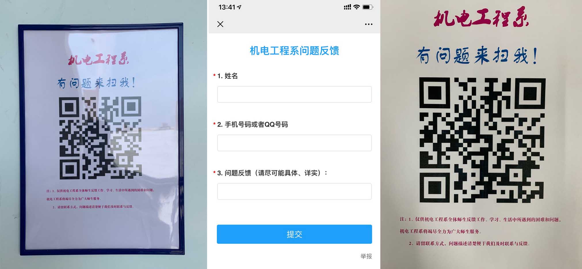 同学们只需打开手机,扫描张贴在宿舍门厅走廊、教学楼通道等位置的二维码图片,即可直接进入问题反馈平台,填写个人身份信息和需反馈问题。系部每天安排专人收集信息并及时帮助学生解决遇到的实际问题,力争做到迅速知晓,及时响应、平复新生入学后环境不适应导致的情绪问题和其他学习生活的需求。目前该反馈平台已试行两天,共收到近百条来自系部各专业同学的问题反馈信息。