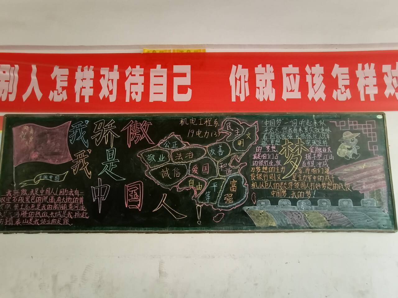 为了增强同学们的爱国热情,构建文明和谐的校园环境,激励学生为实现中华民族伟大复兴的“中国梦” 坚定理想、努力学习、奋发图强,机电工程系于11月10日组织开展了“中国情、中国心、中国梦”主题黑板报评比活动。
