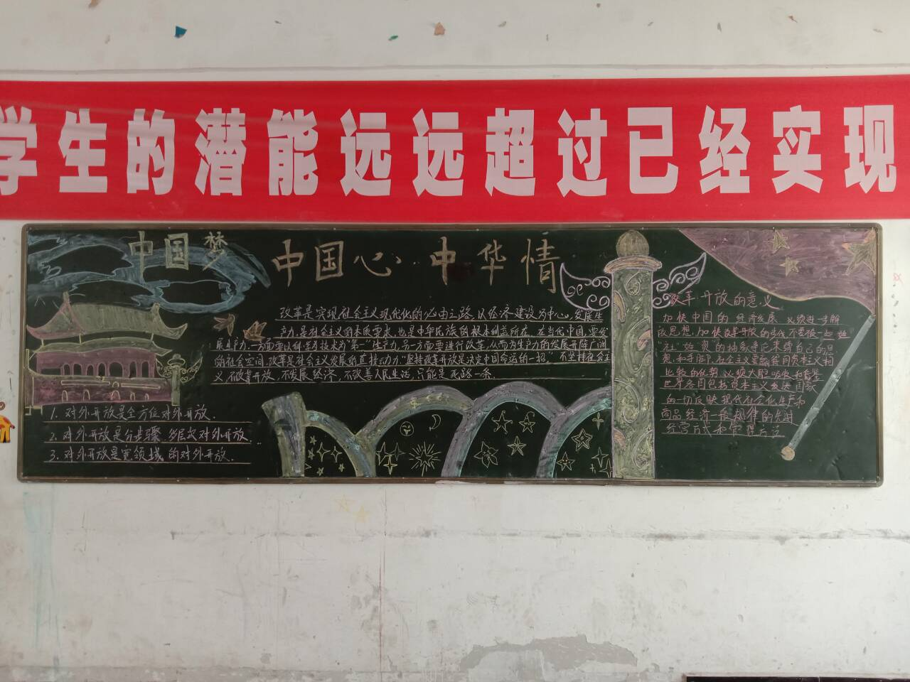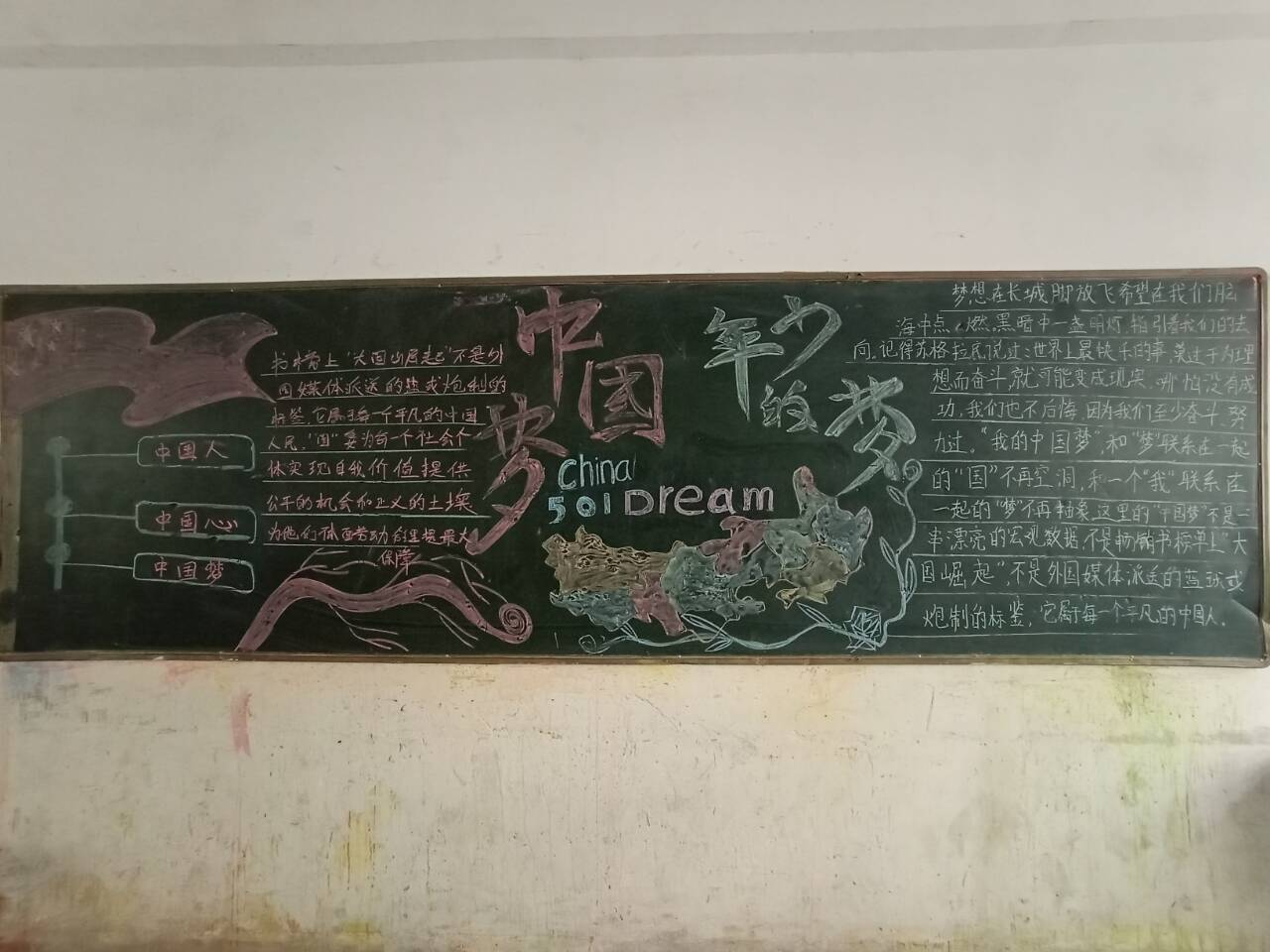 活动中,各班级积极搜集“中国梦”相关资料,认真探讨版面设计,用精美的插图和优美的语言文字抒发着对祖国的热爱,抒发着自己对“中国梦”的美好愿景,设计出了拥有班级特色的“中国情、中国心、中国梦”主题黑板报。
