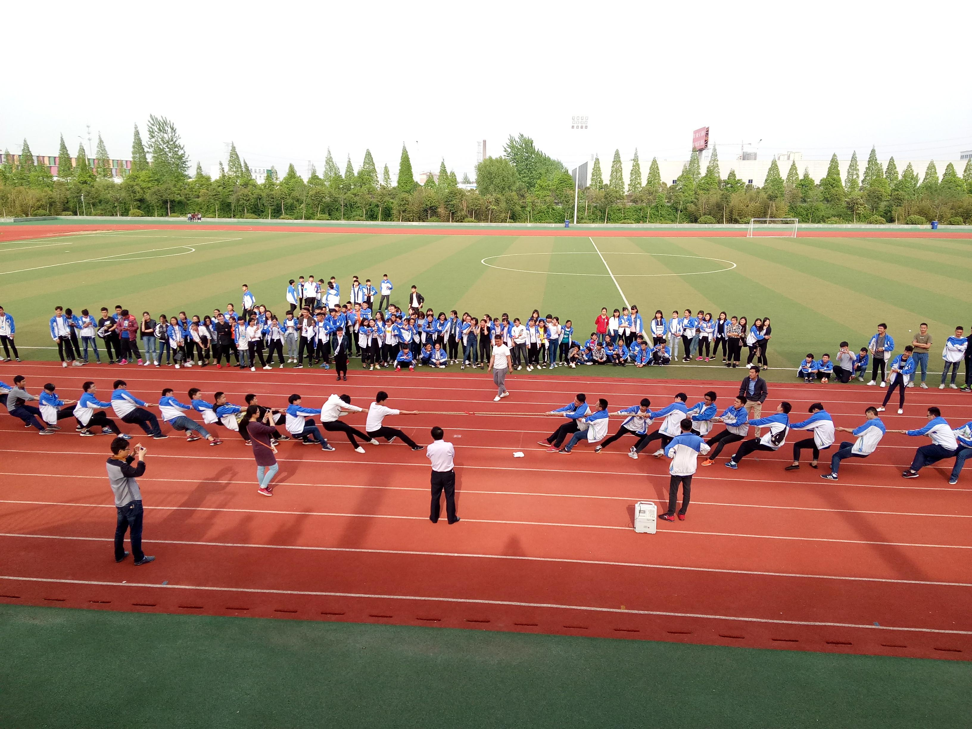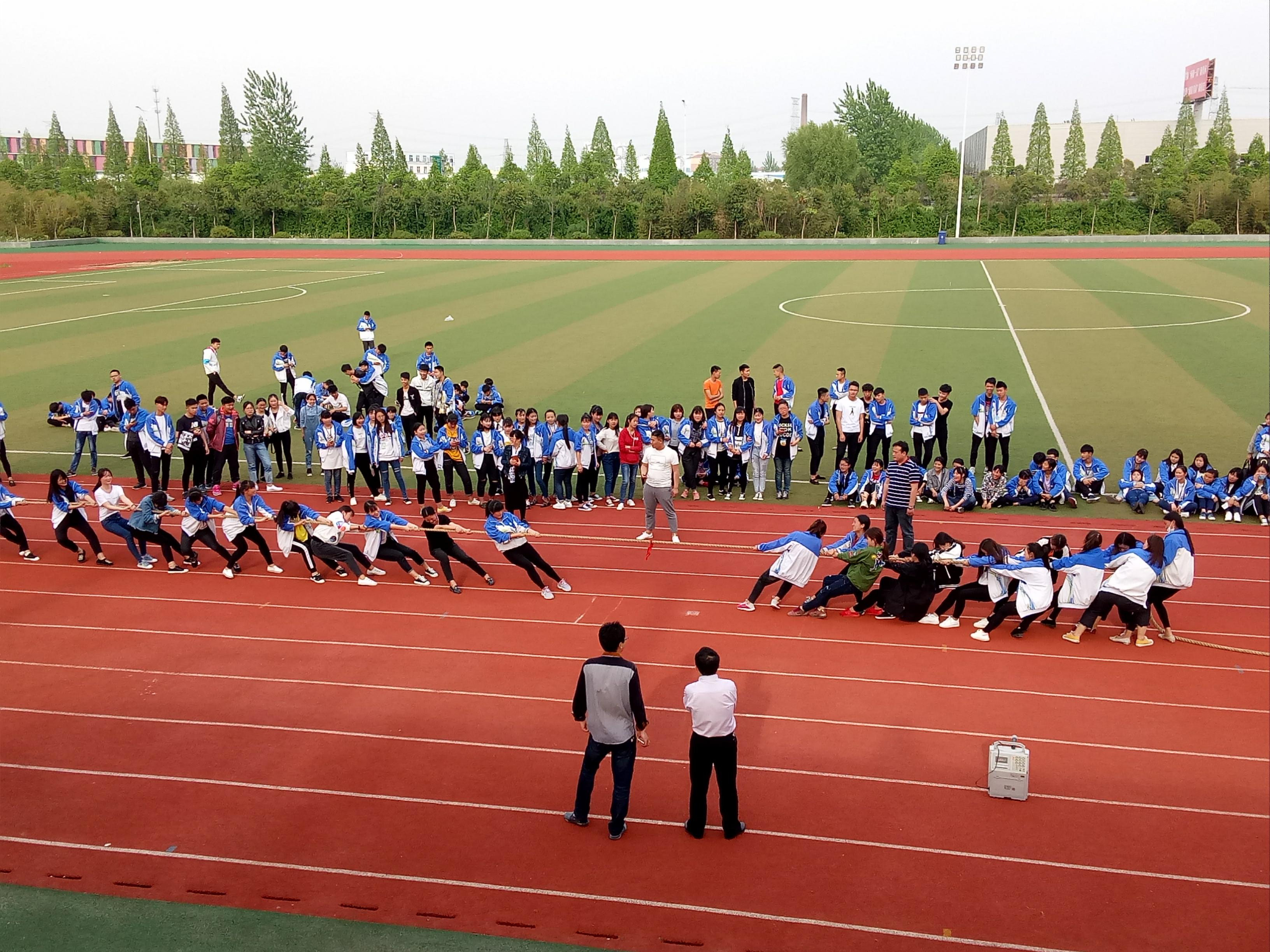 比赛现场,所有参赛班级的队员个个精神饱满、斗志昂扬,充分体现了电子信息系学生的朝气。 比赛一开始,现场气氛异常高涨。双方队员紧紧抓牢手中的绳子,勒绳下腰,降低重心,齐心协力往后拉。热情的啦啦队员在场外高喊着“加油!加油!”,震耳欲聋的声音此起彼伏。参赛队员全力以赴,每颗心都因长绳上那小小的红线而紧张着!每场比赛都牵动着在场老师和同学们的心,在现场热烈气氛的熏陶下,老师们也情不自禁地加入了啦啦队伍中,在此起彼伏的呐喊声中,师生融为一体,心与心贴得更紧了。每场比赛,参与的同学,没有一个不是拼尽全力的,手磨破了咬牙坚持,为了班级的荣誉,每位同学都发出了属于自己的怒吼声。周围的同学们虽没有参加,却也奋力地为自己的班级呐喊助威,把比赛的气氛一次又一次的推向高潮。