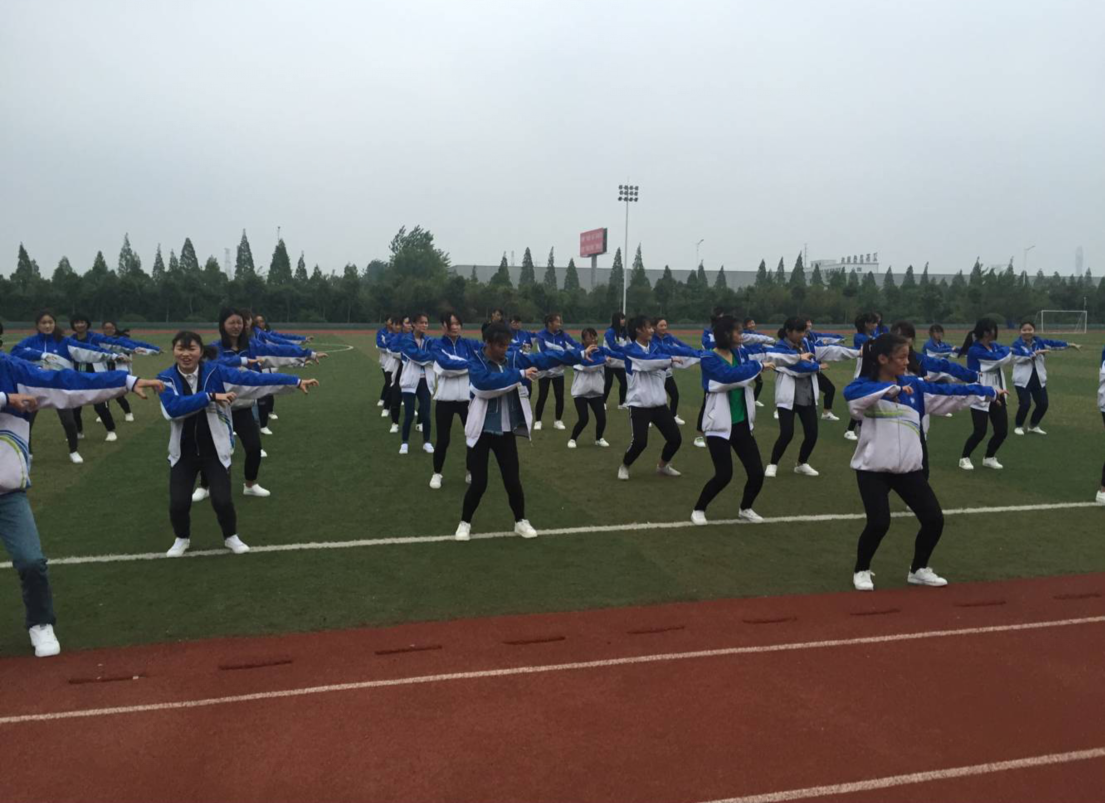 电子信息系五禽操的训练定于每天中午1:00、下午17:00进行。一遍遍重复的动作,一天天高强度的训练,没有消磨掉学生们的热情,学生感慨:“每天教室、餐厅、田径场,三点一线的生活,我们反而觉得很充实、很快乐……”。嘹亮的口号、整齐的队伍无不在体现着青年人昂扬向上、自信阳光的精神面貌。