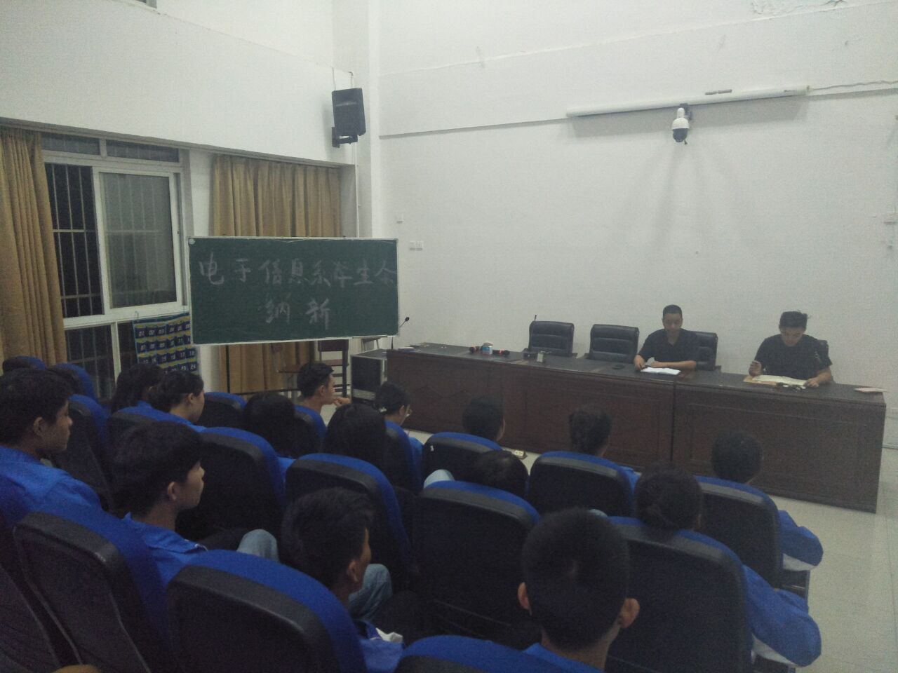 为加强学生自主管理,9月8日晚,电子信息系举行了学生会纳新活动。系部负责人刘宝松、学生管理负责人张亚林老师参加活动。