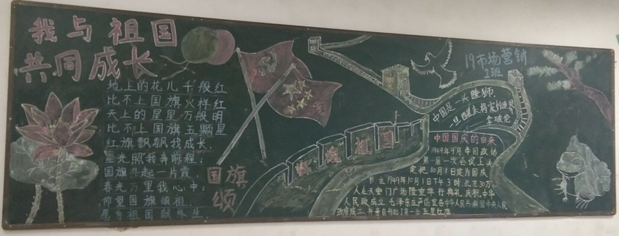 在系部精心安排下,各班主任精心指导, 各班学生充分利用教室后墙黑板,紧扣“庆国庆,弘扬民族精神”的主题,发挥聪明才智,大胆创新,板报内容充实,构思新颖,主题鲜明,图文并茂,文字优美、色彩和谐、风格各具特色,充分展现了系部师生积极向上的精神风貌,营造了浓郁的校园文化氛围,表达了对祖国的热爱。通过评比,最终19市场营销1班获得一等奖,19市场营销2班获得二等奖,19计算机2班、19计算机1班获得三等奖。
