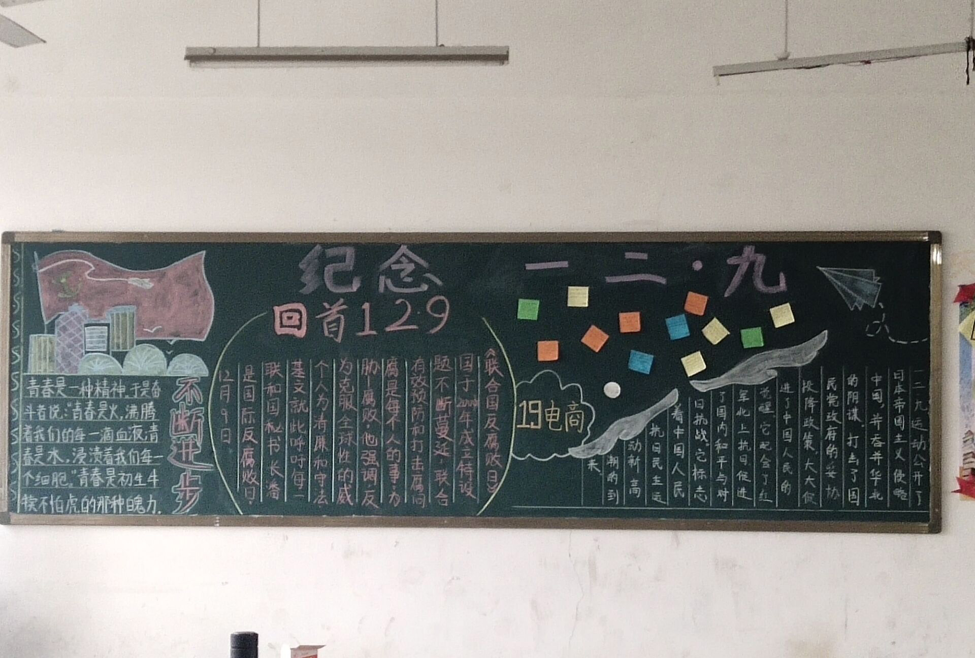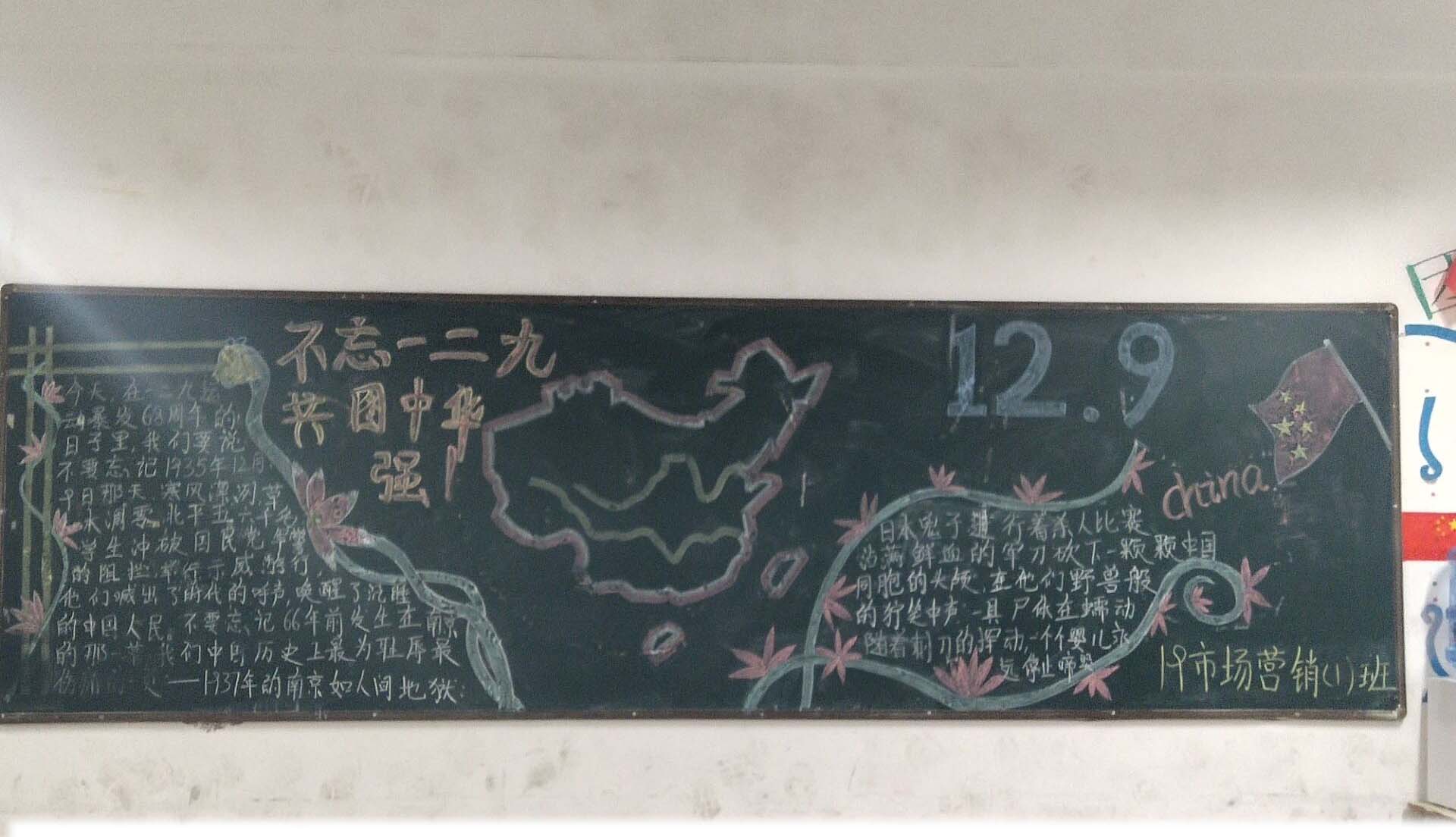 为纪念“一二·九”运动,弘扬中华民族优秀文化、传承中华文明,培养学生热爱祖国传统文化的热情,11月20日至27日,电子信息系举行了以“勿忘一二·九,共图中华强”为主题的黑板报评比活动。