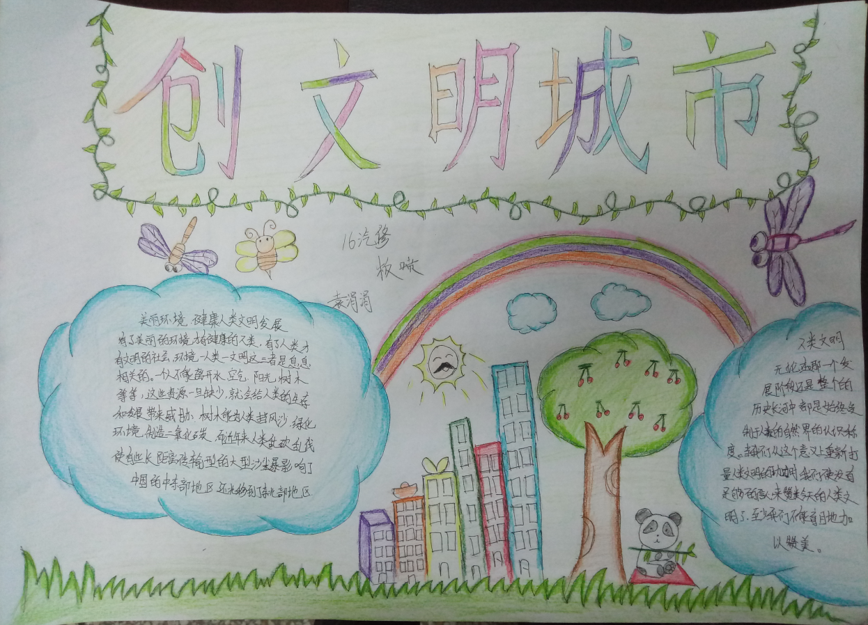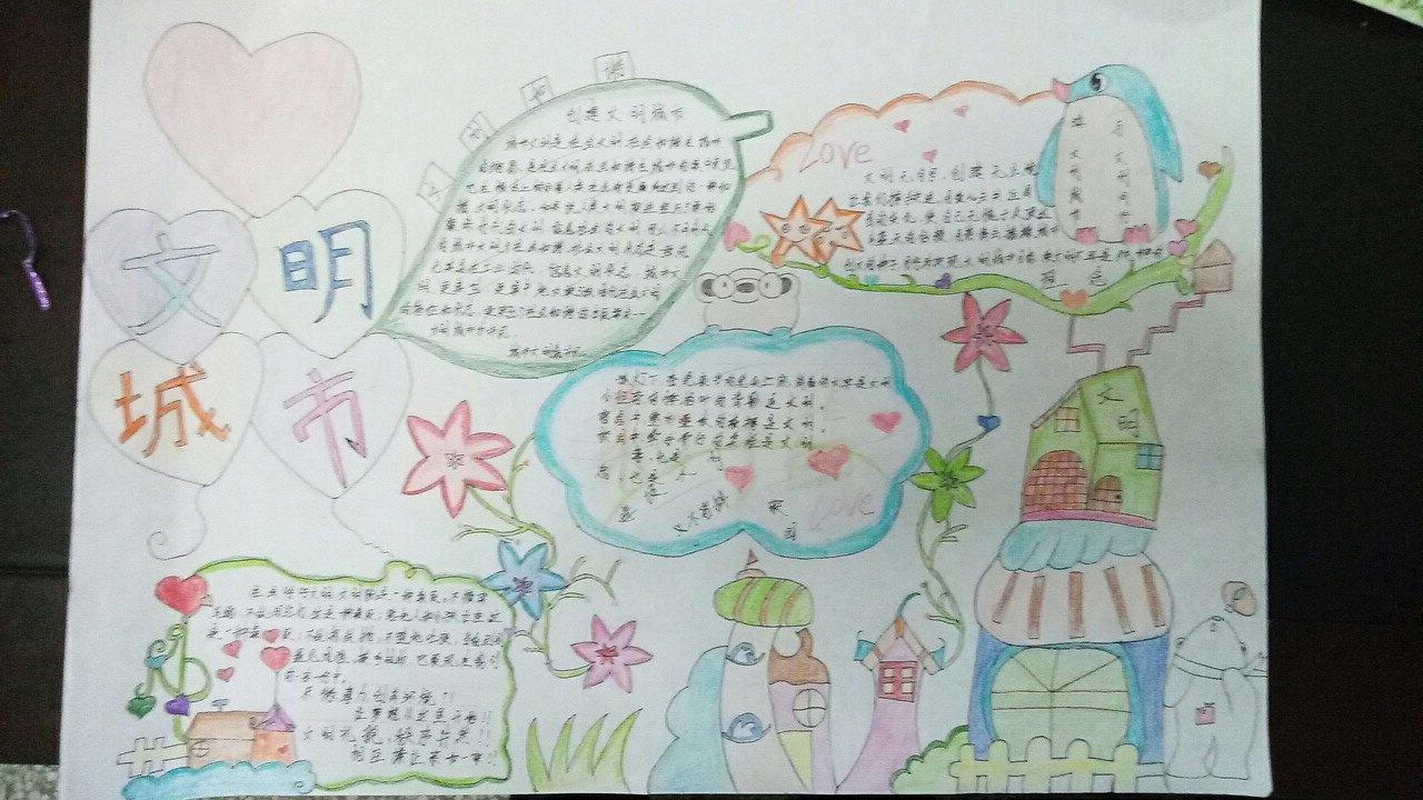 本次手抄报活动主要根据目前创建文明城市的基本方针,再结合学院的各项文明创建举措,有针对性的进行手抄报活动。环顾身边,文明城市、文明校园创建的成效与变化很大,然而,不文明行为依然存在。比如行车不文明——进校园汽车不推行、校园车速过高、随意鸣笛、随意变道;出行不文明——行人闯红灯,乱穿马路、翻越栏杆,乘坐公交不排队、争抢座位;用餐不文明——就餐时高声喧哗、不主动排队、衣着不整、举止不雅;校园生活不文明——高空抛物、乱丢垃圾、乱贴乱画;公共场所不文明——随地吐痰、言语粗俗、观影观赛喧哗起哄、禁烟场所吸烟、破坏公共设施……希望通过我们这次文明城市创建手抄报活动可以进一步的宣传文明的意义,让身边的不文明行为得到改善。