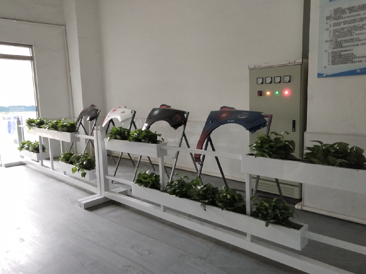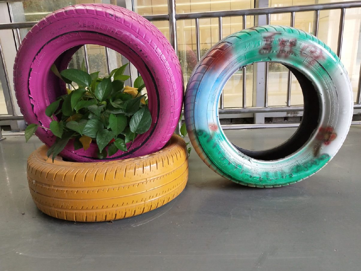 轮胎经过多次拆装之后已经失去了他的实际作用,但是在汽修学生的手里它换上了新衣服,并且完美的呈现在我们的眼前;废旧的翼子板在汽车涂装的学生手中变成了一件件艺术品,成为了实训基地的一道风景线;绿色植物的装点,让整个实训基地生机盎然……