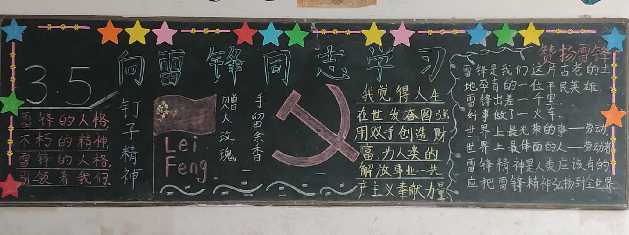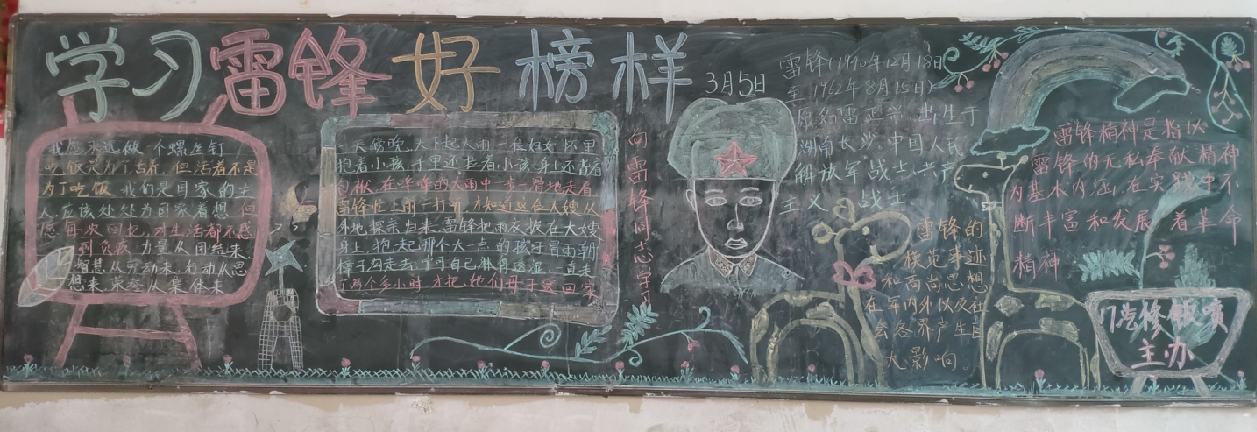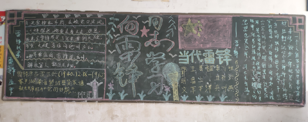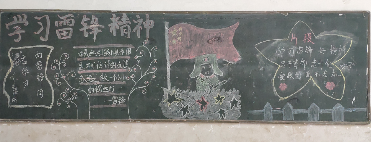 本次黑板报要求设计内容切合主题,突出雷锋精神的内容。对此,各班级学生认真对待,交出了一幅幅高质量的作品。活动中,各班积极参与,精心设计,充分利用黑板报这块宣传阵地,对雷锋的生平事迹进行全方位报道,展现雷锋的形象,赞扬雷锋的“钉子精神”,展示了同学们对雷锋精神的感悟和理解。