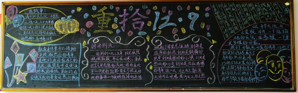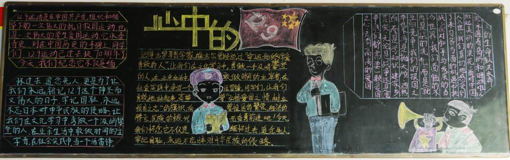各班的黑板报版面新颖,图文并茂,具有一定的针对性和可读性。通过丰富多彩的图文形式使同学们了解到“12.9运动”是历史上一个重要的爱国运动,历史是我们不能忘记的!