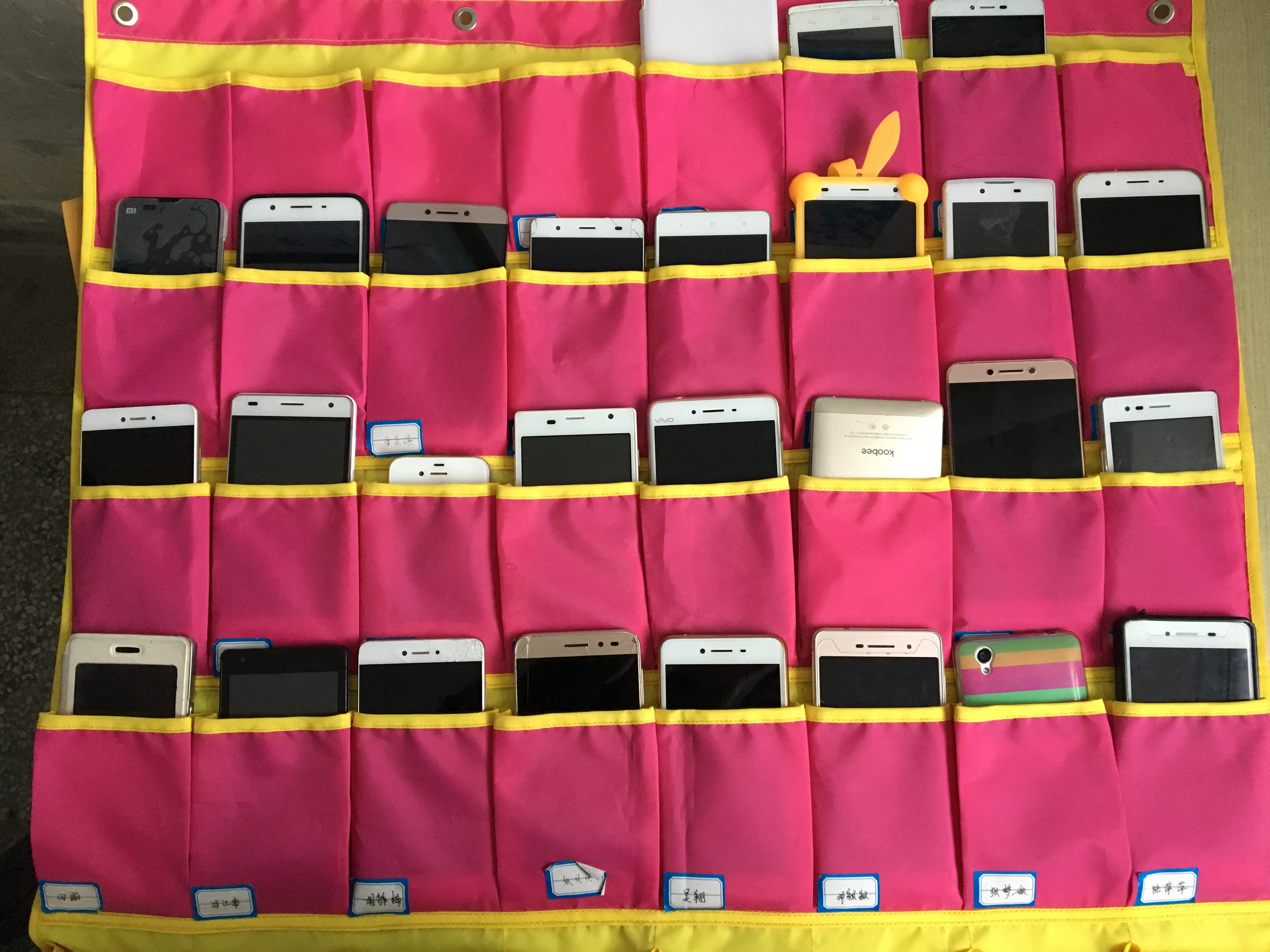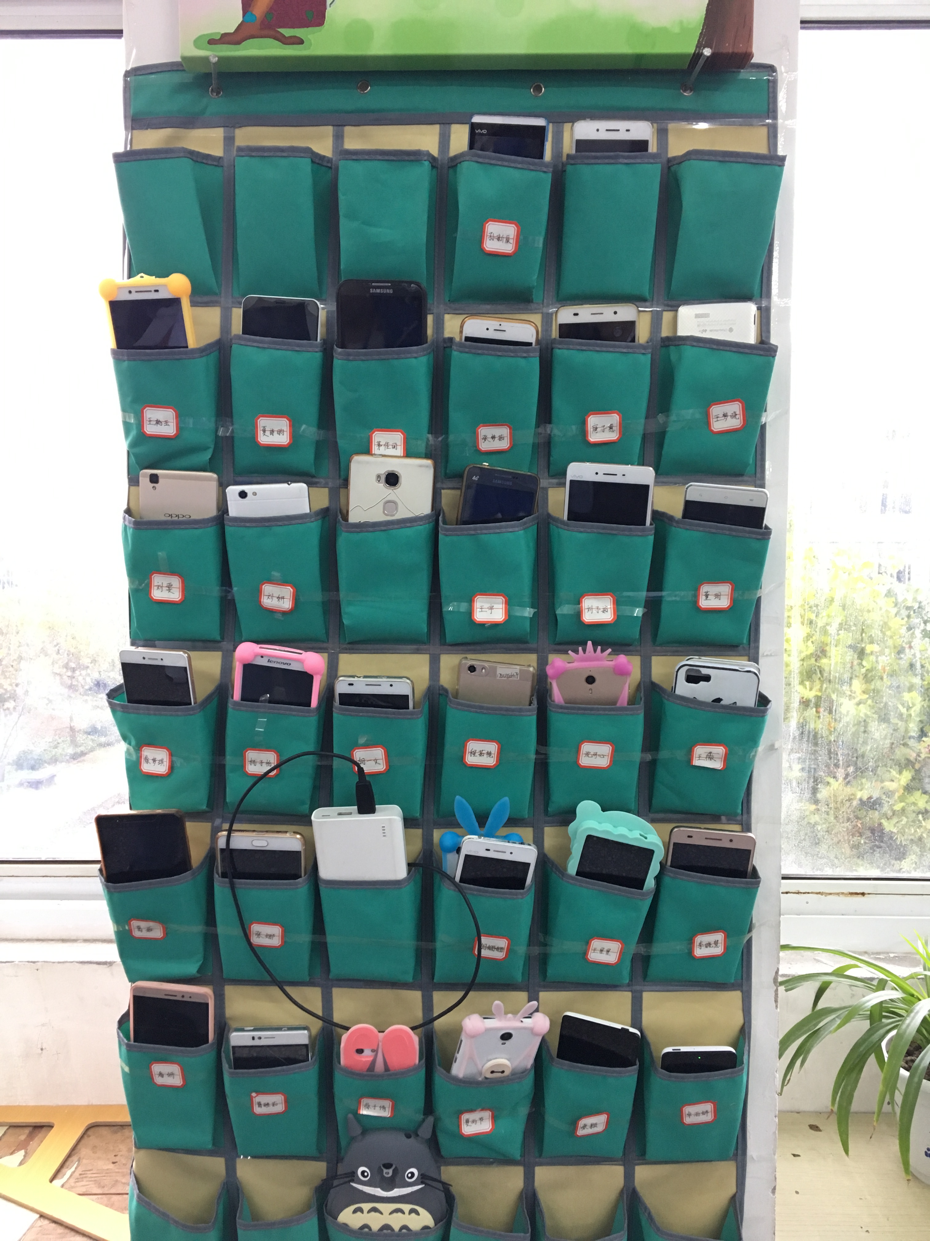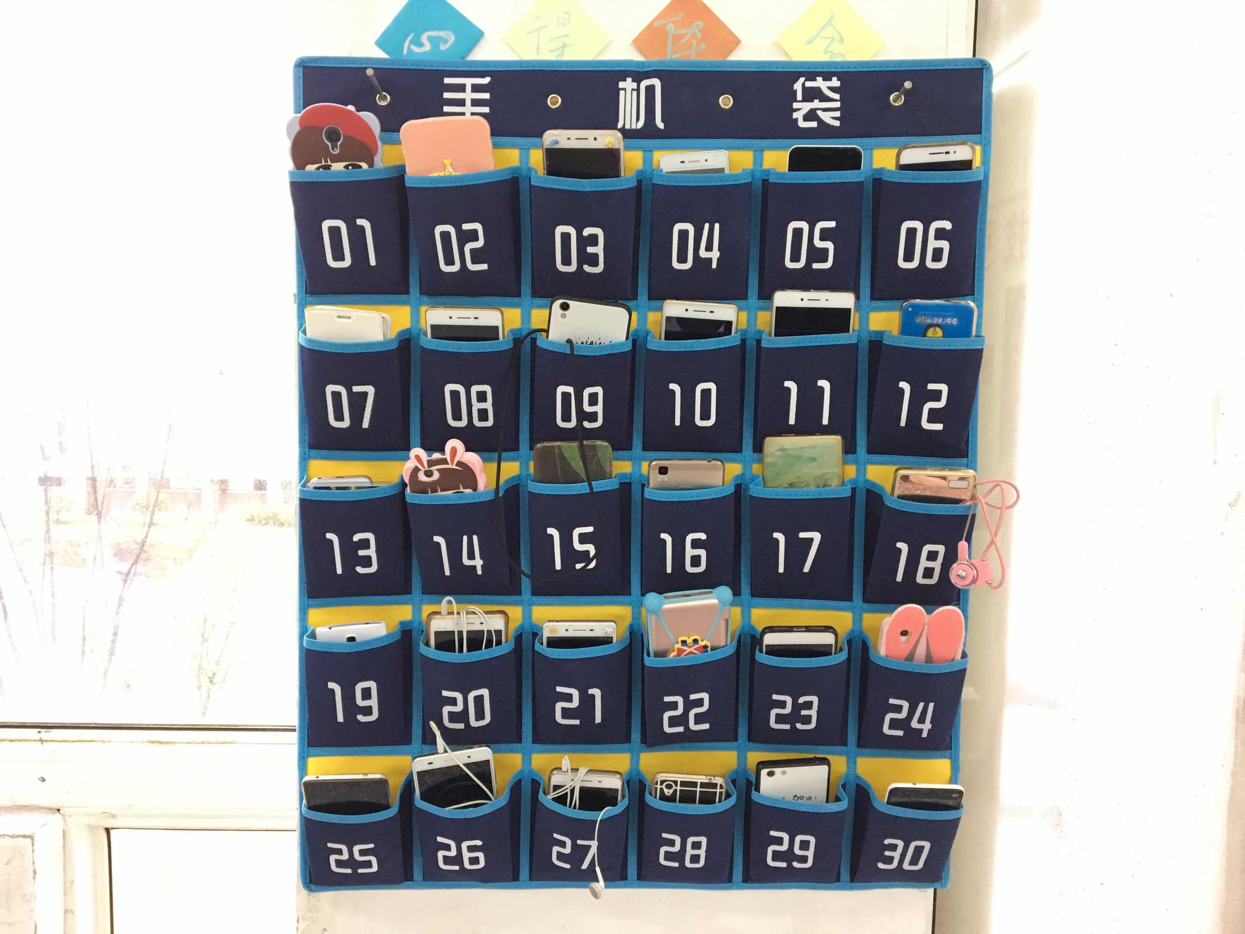为改善课堂中的“低头”现状,营造健康的学习环境,我系在每个教室都配置了手机袋,帮助学生摆脱手机依赖症。每个手机袋上都标有号码,每位同学认领一个号码,在上课预备铃响以后,由班长监督将手机对号放到手机袋中;同时,我系也杜绝各位教师将手机带入课堂,做好绝对的表率和榜样作用。