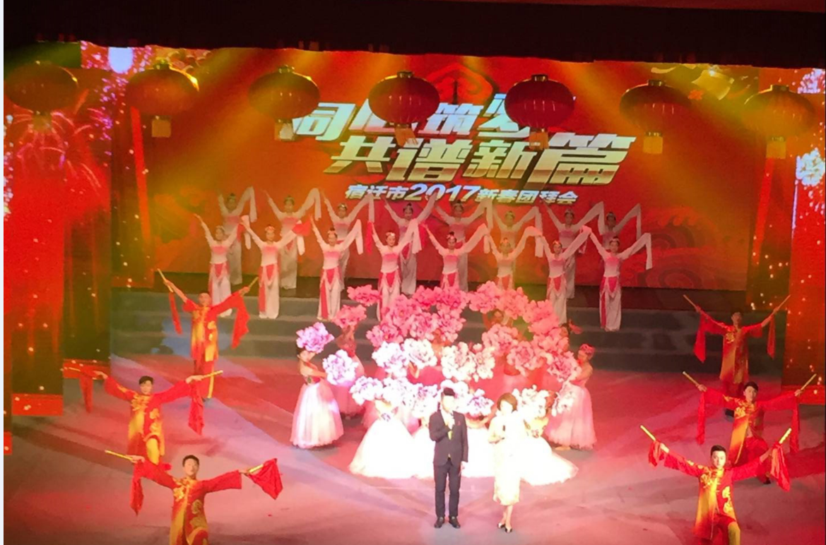 市委书记魏国强代表市委、市政府向全市人民拜年,并致以节日的祝福;同时指出“上下同欲者胜,同舟共济者赢”,我们应更加紧密地团结在以习近平同志为核心的党中央周围,不忘初心加油干,扑下身子务实干,加快建设“强富美高”全面小康新宿迁,以优异成绩向党的十九大献礼!团拜会现场掌声连连、笑声不断。市各界艺术家和演员们带来了精彩纷呈的节目,将现场气氛烘托得喜气洋洋。在喜庆热烈的气氛中,淮海技师学院商贸服务系学生艺术团献上了精彩的表演,赢得在座各界人士的一致好评,这既是淮海技师学院学生队伍艺术素养成长的见证,也是对宿迁美好明天的衷心祝福。艺术团的小演员们利用寒假时间精心策划、积极排练,最终挑选出三个节目献礼团拜会。藏族舞蹈《康定溜溜的城》,姑娘们在美丽的康定情歌伴奏中,用那优美的舞姿,向着舞台,跳出了火一般的热情;合唱《心动林海》,一首江南词也写不尽的涛涛林海,学生却能用特有的洒脱与空灵,摇曳出那份闲情逸致;歌伴舞《板蓝花儿开》,故乡的板蓝花留住了我的根,留住了我的爱,无论走到哪儿,都是我的羁绊。同学们用多种艺术表演形式,奏出了人民幸福和谐的时代音符,展现出一幅幅盛世祥和的美好画卷,同时也表达了我们淮海群众欢天喜地过大年的喜悦之情。
