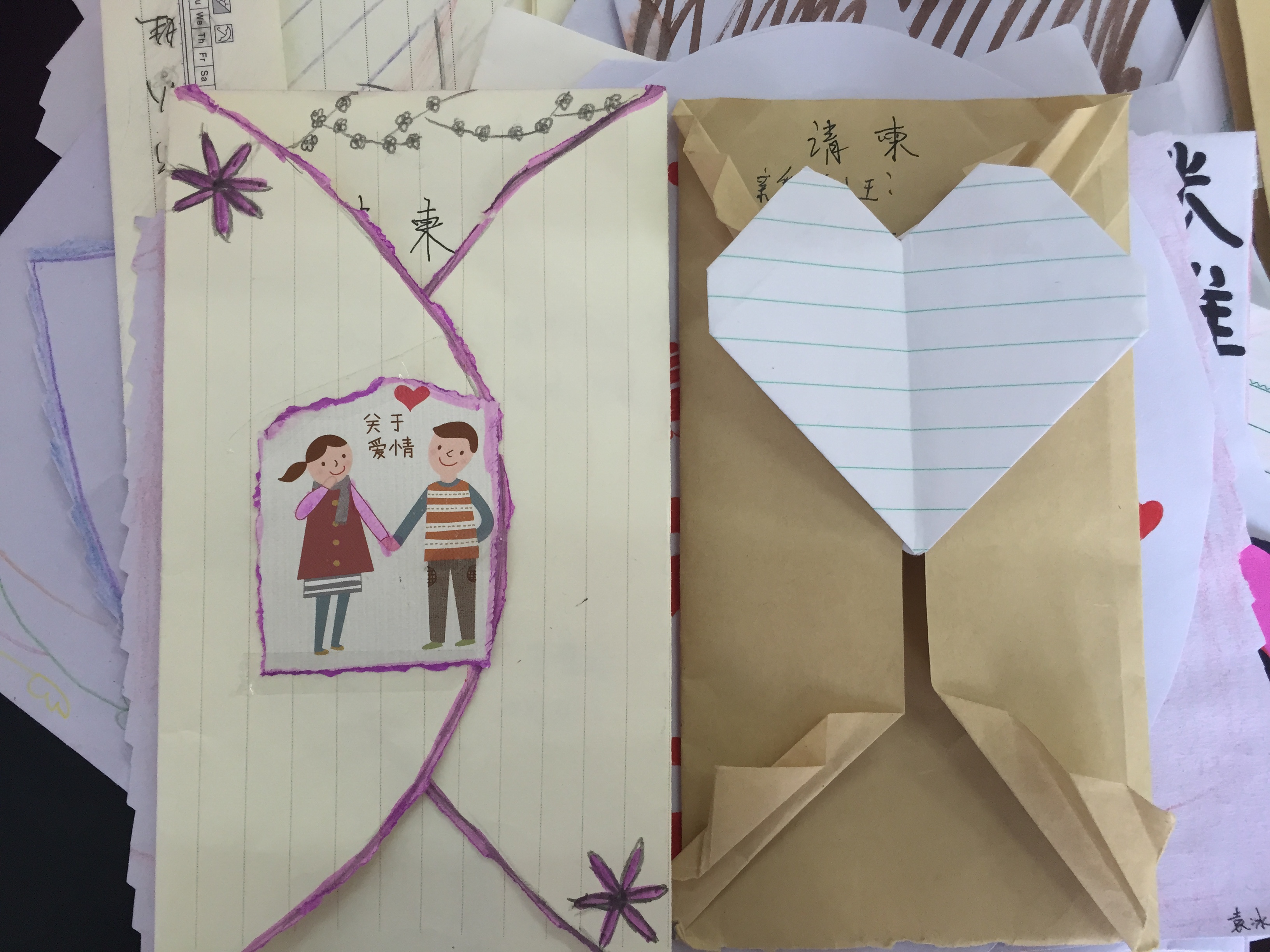 传统的请柬主要分三种形式,正方型,长方型,长条型,这些产品的外形和尺寸都有一定的比例和大小。但是同学们不拘一格、大胆创新,制作出了许多形式新颖、外观独特的个性化请柬,千纸鹤、纸船、飞机、书本、花篮、信封等等各类形式都被巧妙借鉴到大家的设计中。