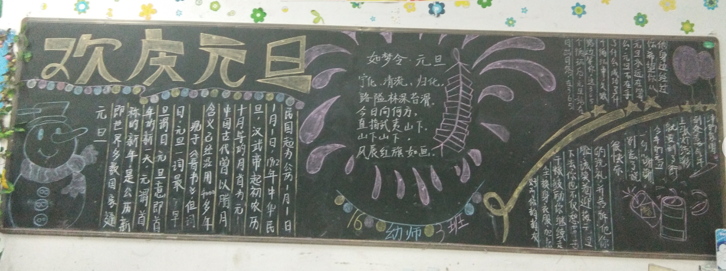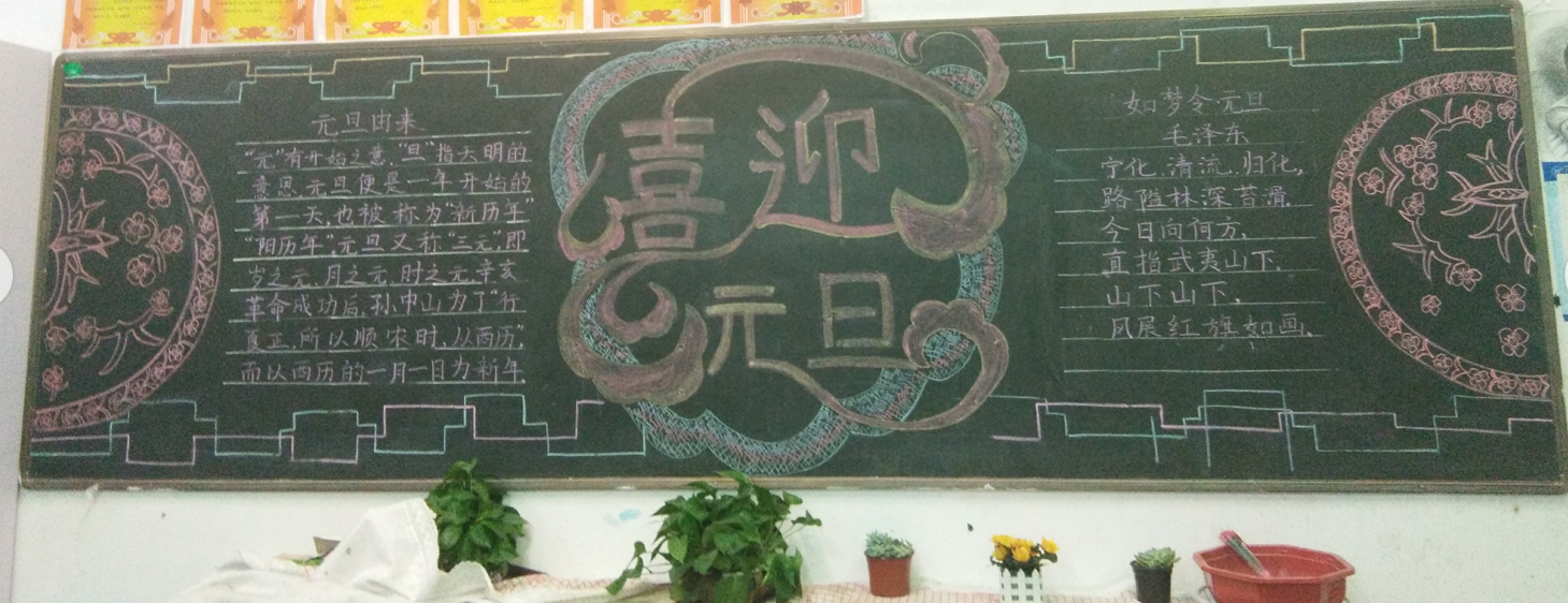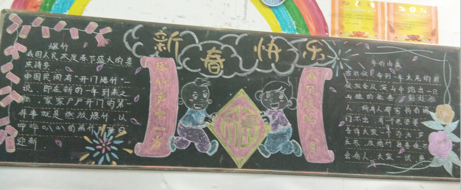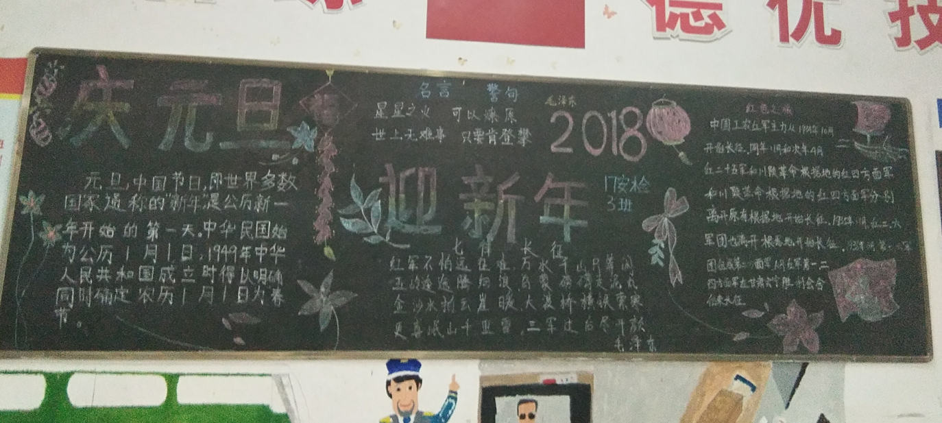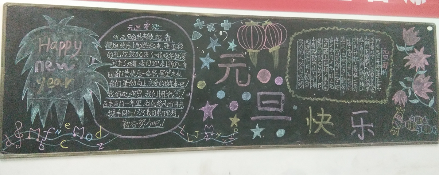 本次活动,各班积极参与,精心选材、明确分工、高质高效。板报的内容紧贴生活,紧贴主题,有对新年的期盼,有对未来的美好愿望,有对节日的祝福,充分发挥了学生的自主创新和想象力。各班黑板报布局合理、美观、图文并茂,反映了同学们良好的美术功底和艺术修养,为班级营造出浓浓的艺术氛围。