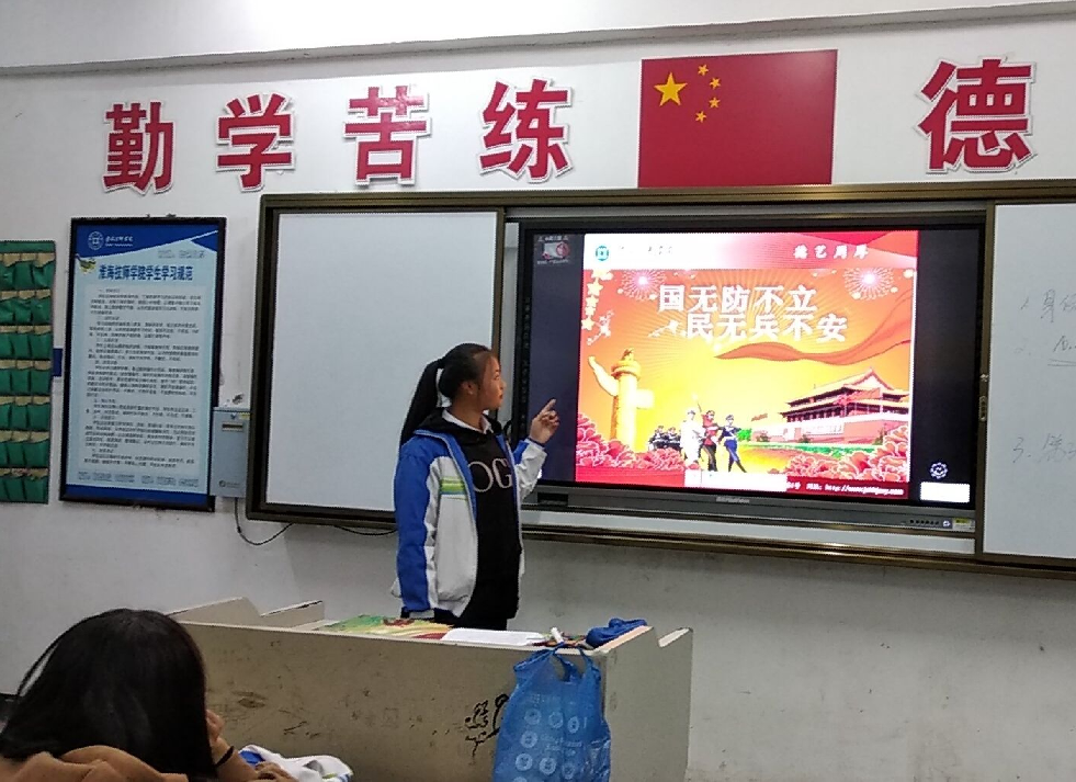思想是行动的先导,行动是思想的注释。各班主任通过讲述生动的故事,结合现代教育技术,围绕“国防力量建设”和“周边环境安全”两大主题进行了深入浅出的讲解,向学生全面阐述了国防建设的重要性。并且通过视频的形式,向同学们介绍“孤岛英雄王继才”几十年坚守国防的感人事迹,教育学生要以努力学习为己任,学习知识,锻炼身体,锤炼意志,做好为国防贡献力量的准备,要文明发言、不信谣不造谣、理性爱国、自我保护。