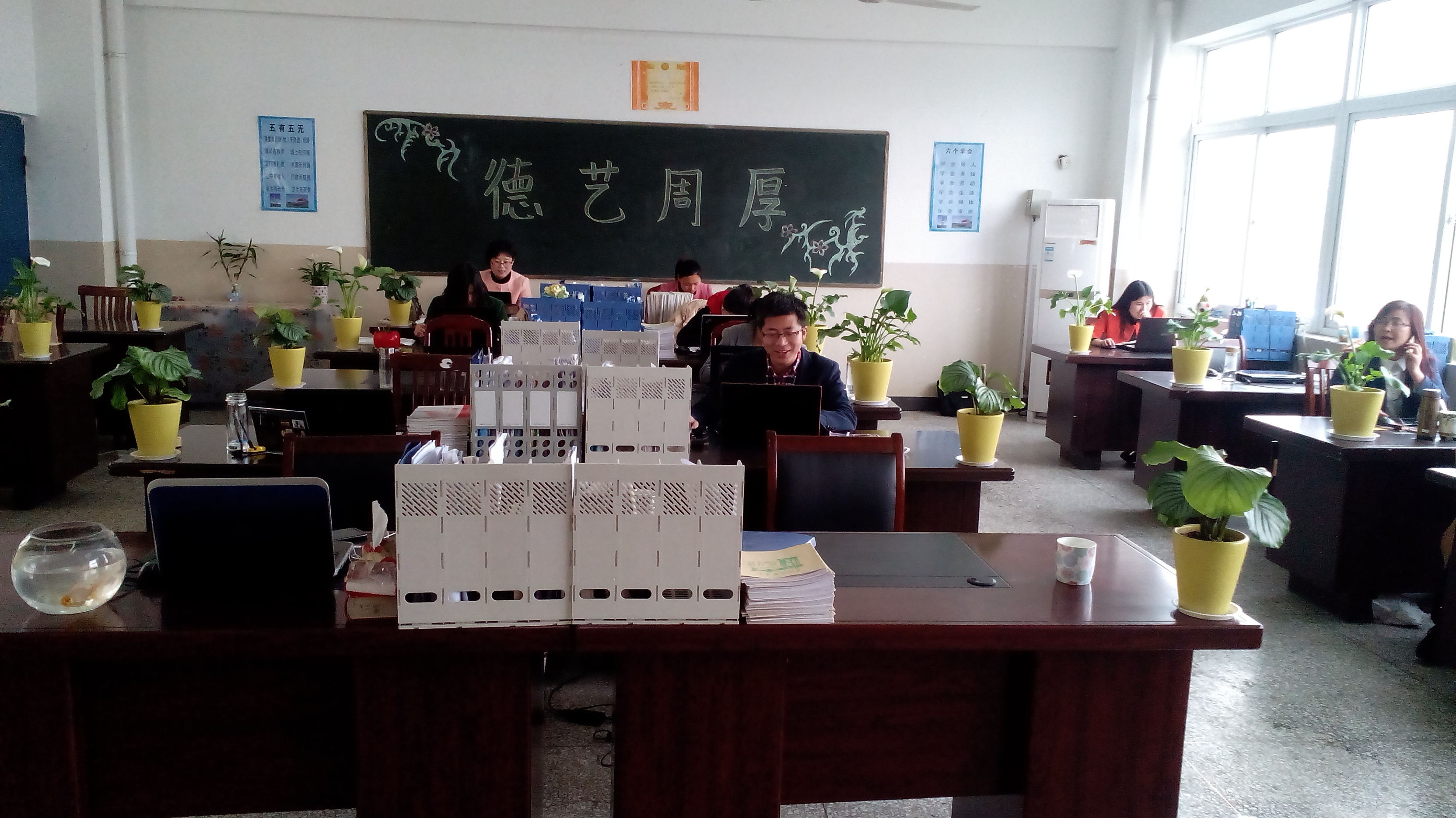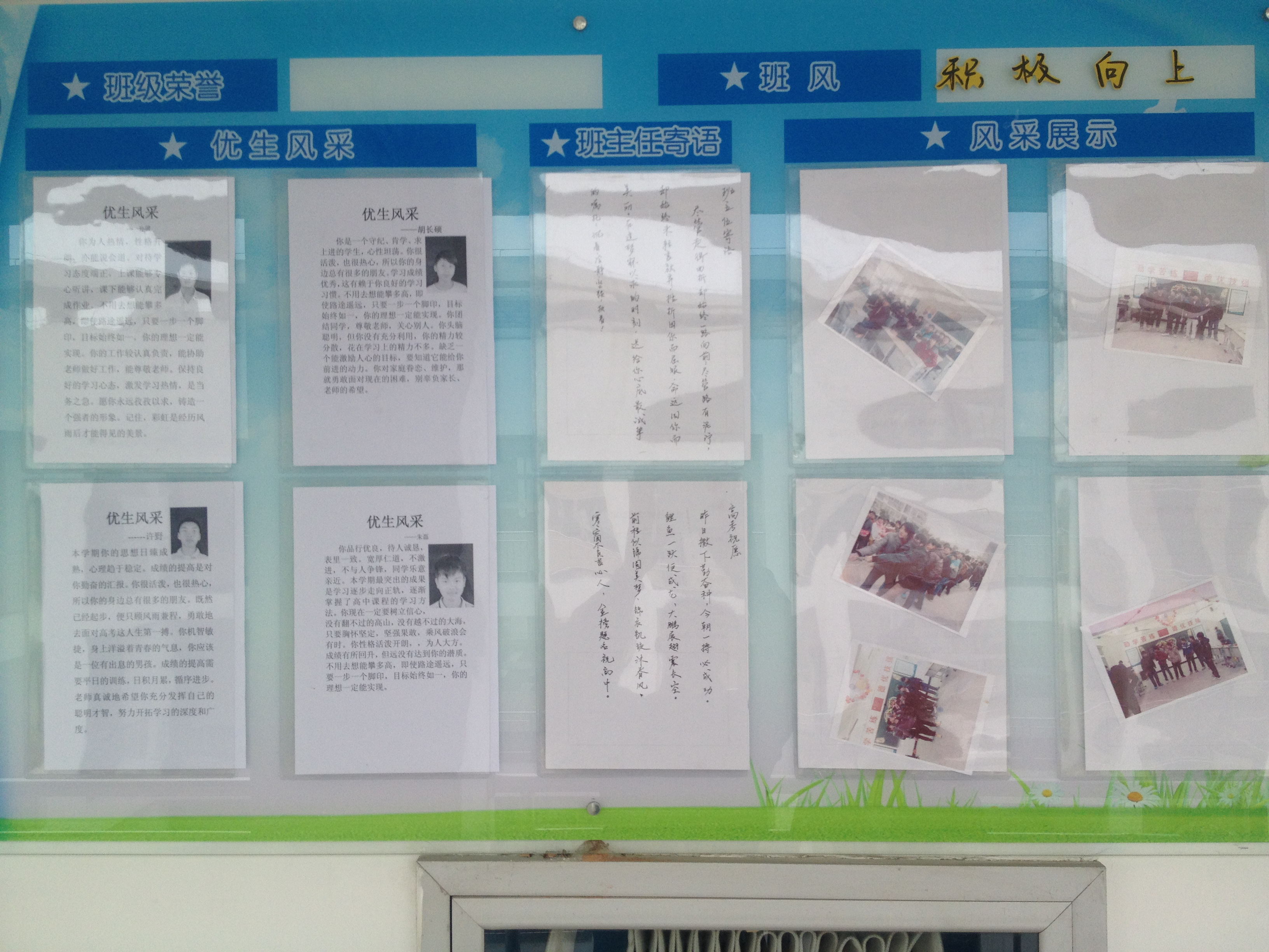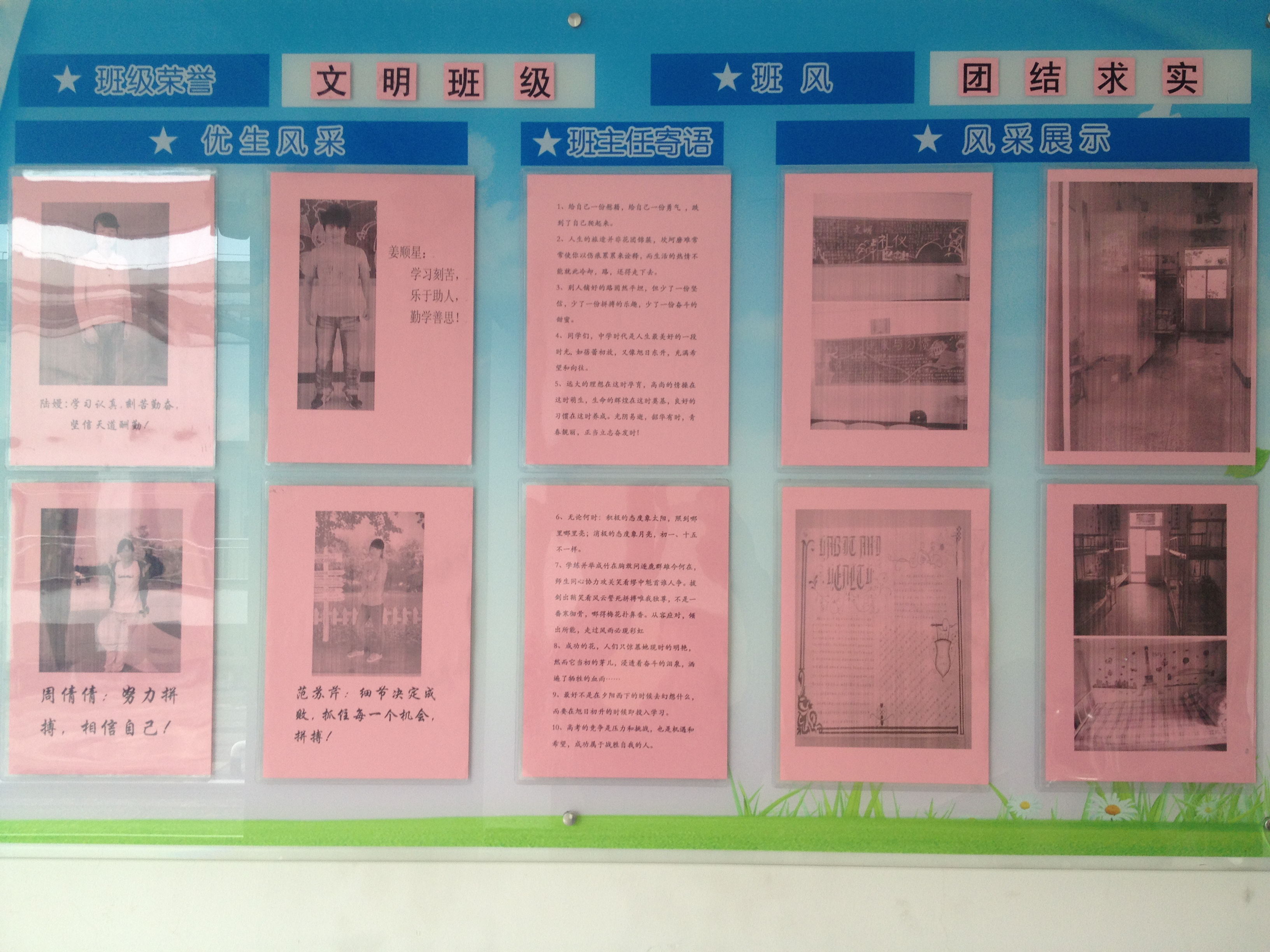 其次,全体师生对系部环境做了精美的布置,教师的办公桌物品摆放整齐有序,摆放了马蹄莲、苹果茱萸、白掌等盆景,微风过去,香气扑鼻;教室里挂上了充满激情的横幅,贴上了师生寄语,展现了学生的优秀风采,书香萦绕,学生置身其中,徜徉书海,收获自是无限。