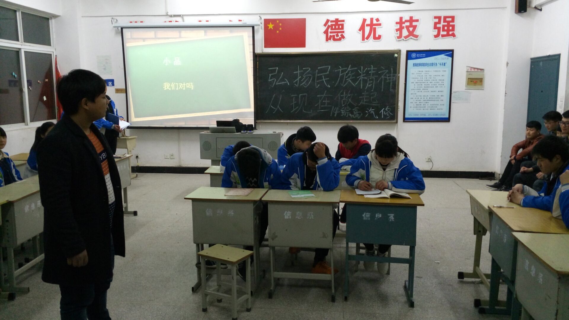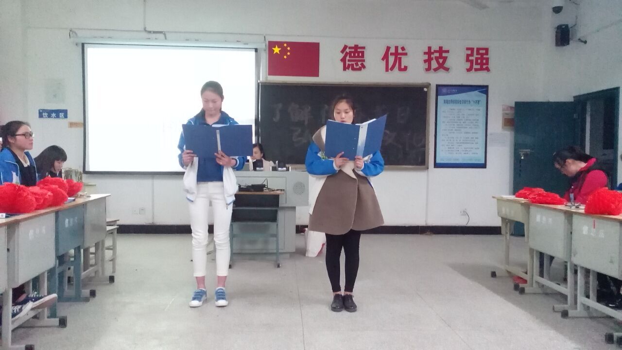参加班会课初赛的班主任按照抽签顺序,带领班级有序来到3203,为大家展示精心准备的班会课。班会课内容紧密围绕“民族精神”、“传统文化”展开,有的全面体现出“传统文化”的“传统佳节”内容,有的重点选取某个方面集中展开教育活动,比如谈“孝”。班会课形式生动、活泼、多样——抢答题、小品、课本剧、情景剧、大合唱等无不体现出学生的用心和才华。与过去班会课显著不同的是,这次许多班级采用了自编自导自演自拍的情景剧来反映学生生活,班主任则充分放手,将主战场交给学生,仅仅在适当的时候进行点评、总结为活动增色。另外,注重与时俱进,如今年谭维维春晚演唱的《华阴老腔一声喊》出现在14综高财艺班的班会课上。