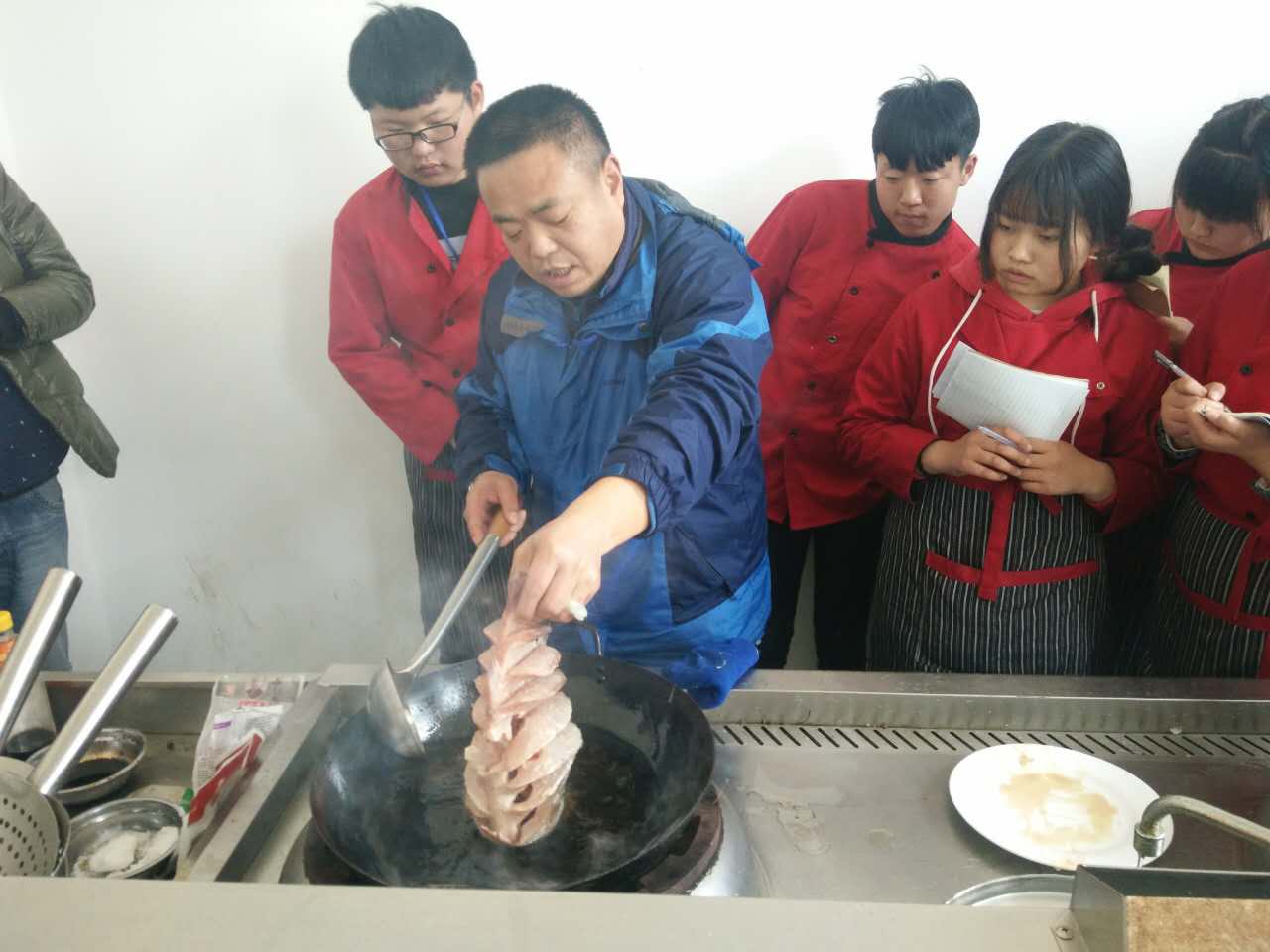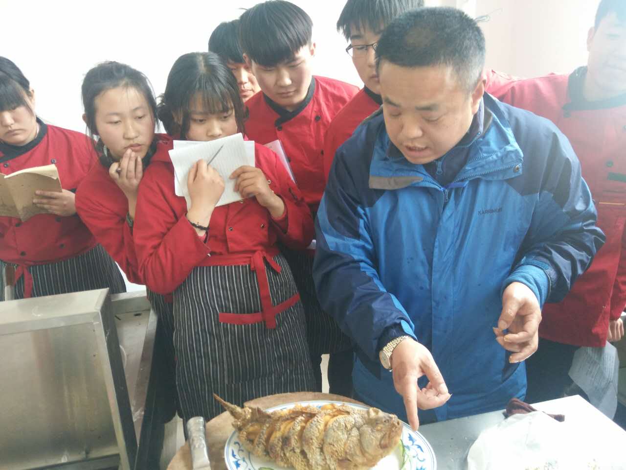 终于轮到同学们自己操作了,大家都跃跃欲试,清洗、翻刀、上火……每个动作都做的有模有样,整个场面热火朝天……不一会儿,一道道金灿灿的奇香鲈鱼出锅了。张老师对每位同学的作品进行了点评。前去听课的各位老师也都品尝了同学们做的鲈鱼,真是外酥里嫩,唇齿留香!