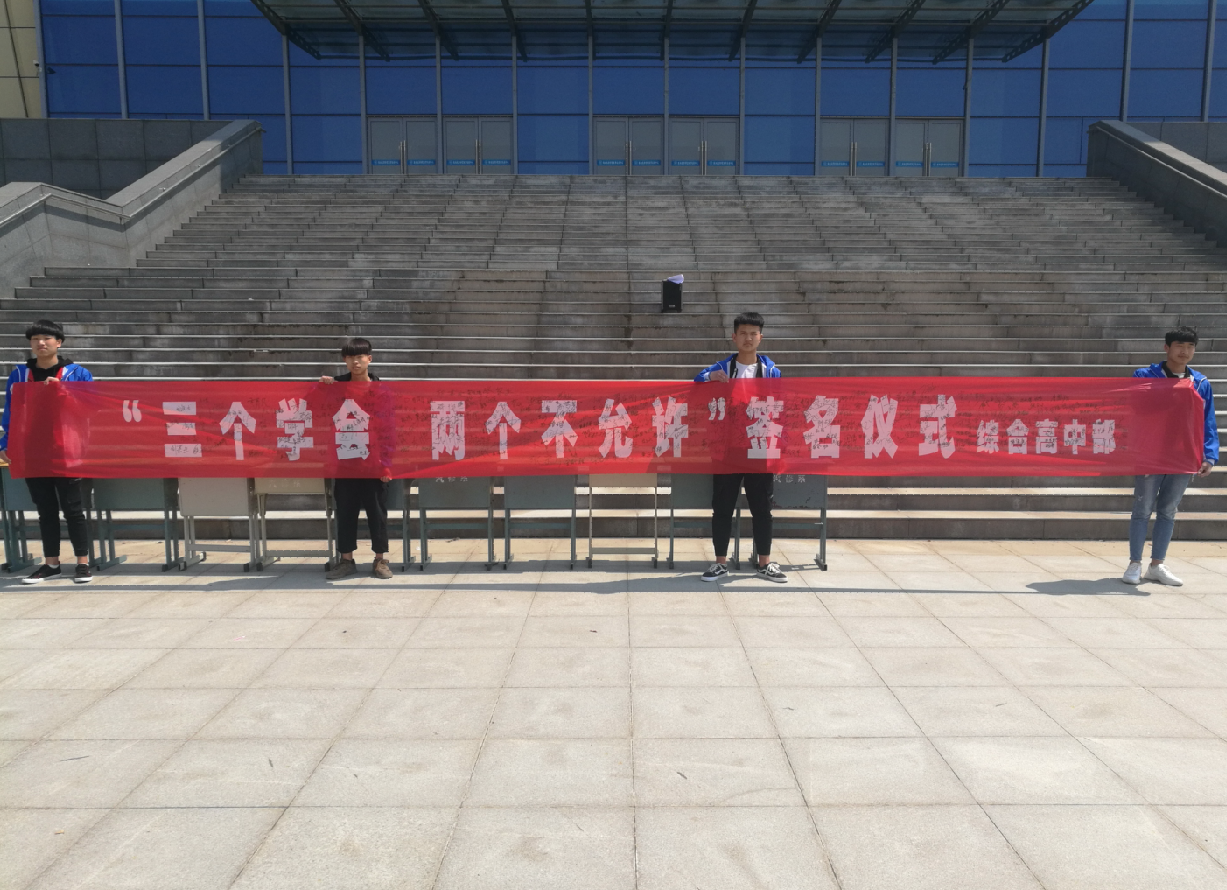 为进一步提高学生的文明素养,倡导文明新风,培养学生良好的行为习惯和学习习惯,进一步强化学生习惯的养成教育,积极推动文明、和谐、卫生、平安校园的创建活动,4月3日上午,综合高中部举行了“三个学会、两个不允许”签名活动。