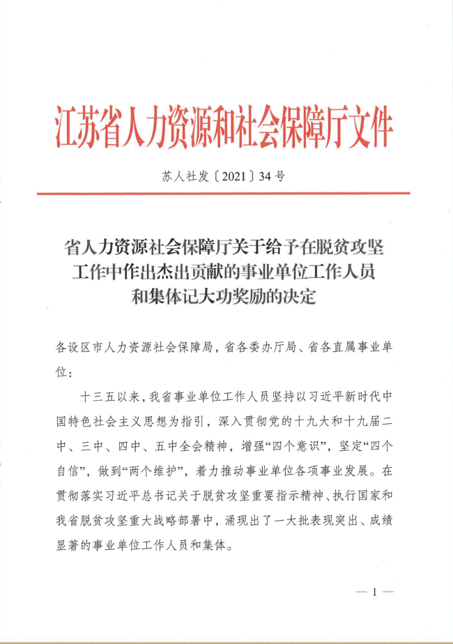 近日,江苏省人力资源和社会保障厅发布《省人力资源社会保障厅关于给予在脱贫攻坚工作中作出杰出贡献的事业单位工作人员和集体记大功奖励的决定》,给予全省事业单位32名个人、23个集体记大功奖励。我院获评全省事业单位脱贫攻坚集体记大功奖励,为全省技工院校中唯一获该项奖励的集体。