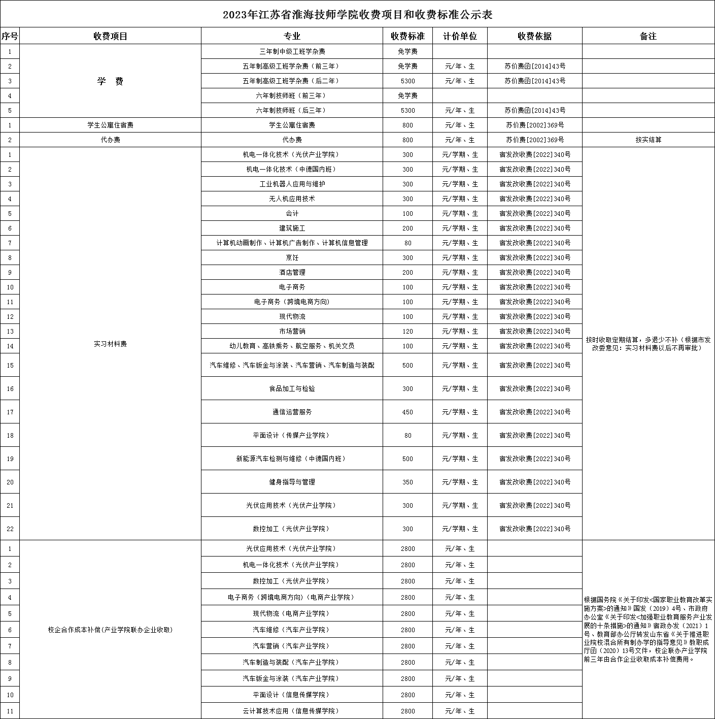 2023年江苏省淮海技师学院收费项目和收费标准公示