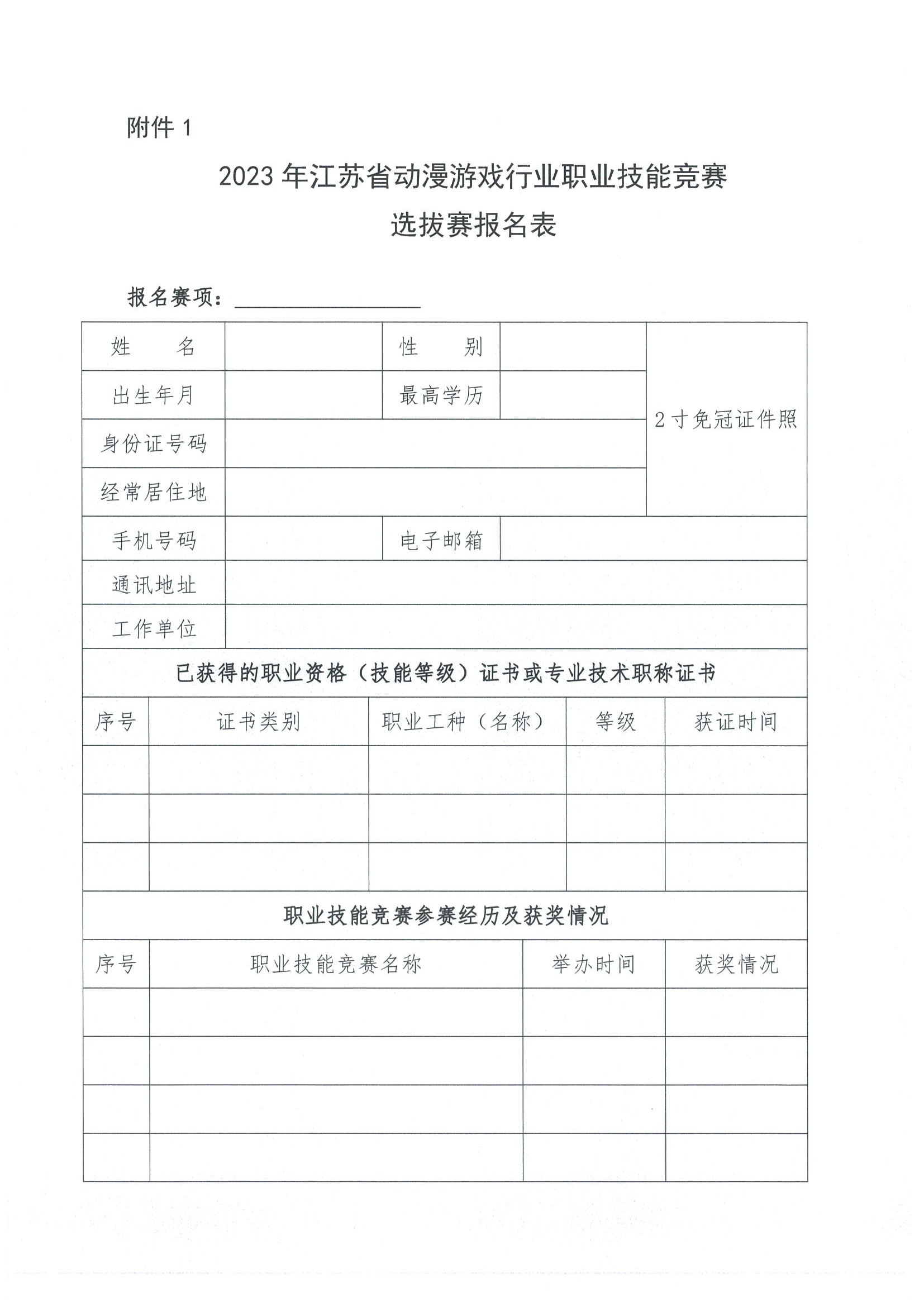 2023年江苏省动漫游戏行业职业技能竞赛选拔赛报名表