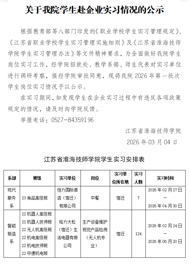 关于我院学生赴企业实习情况的公示