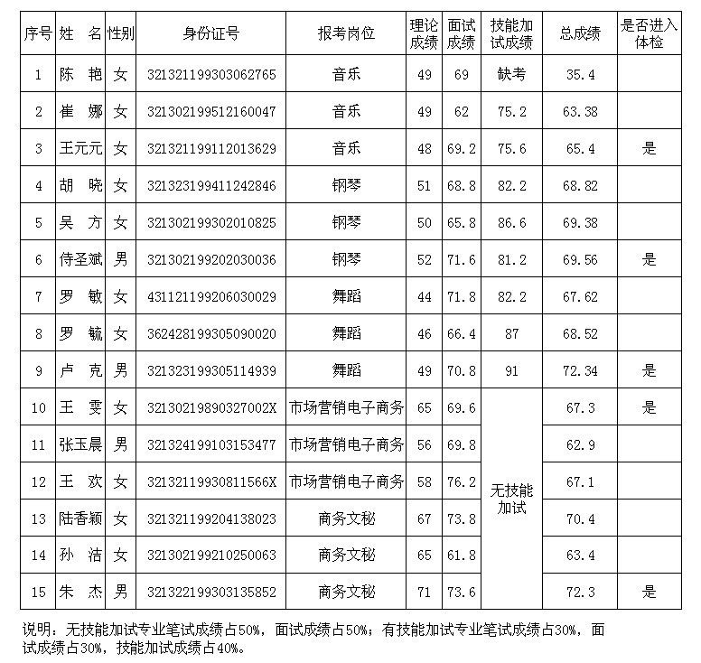 淮海技师学院2017年公开招聘专职教师笔试、面试、技能加试工作已结束,根据实际参加考试人数和岗位需求人数,现将考生总成绩及进入体检阶段考生名单予以公布,并就体检有关事项通知如下: