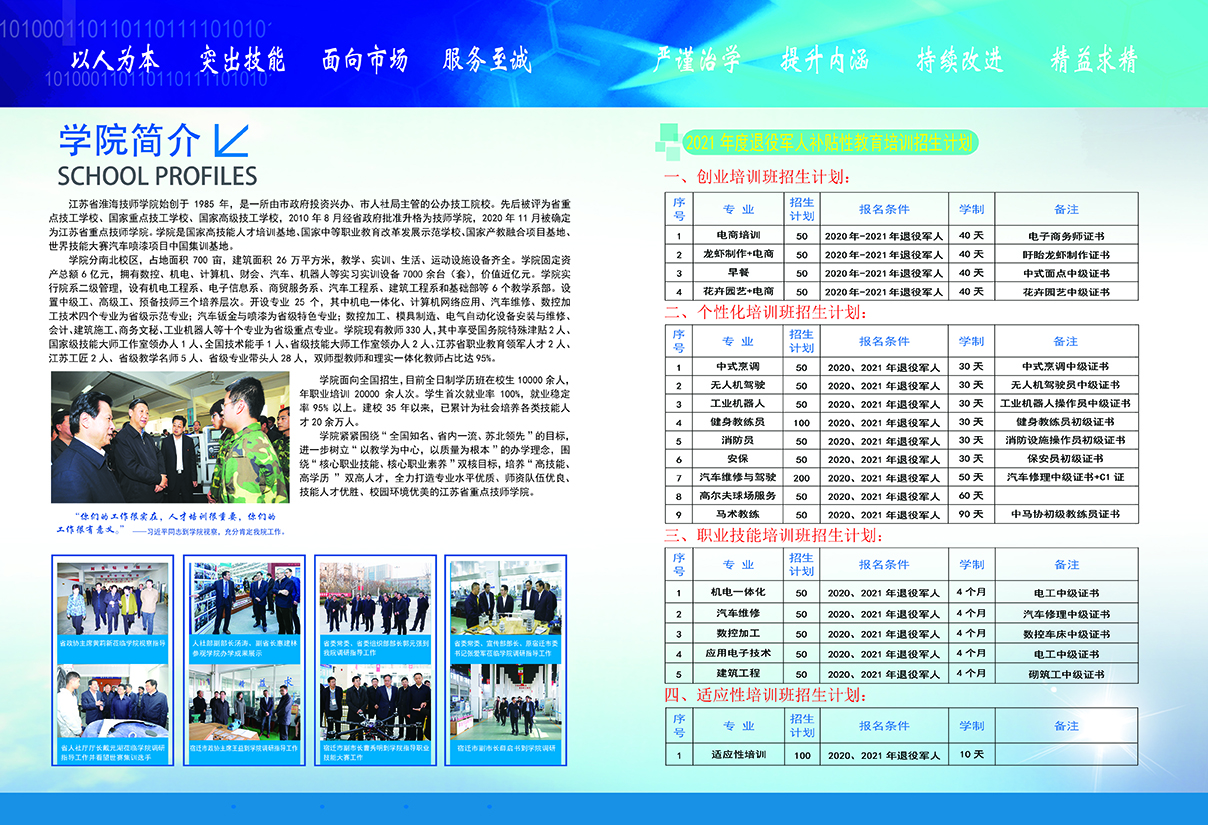 我院作为退役士兵教育培训基地,结合市场急需紧缺岗位,把握地区企业优势,针对退役军人自身特点,开设了创业培训、个性化培训、职业技能培训和适应性培训四大培训项目,共涉及电商、中式烹调、无人机驾驶、工业机器人、健身教练员、汽车维修与驾驶、机电一体化、应用电子技术、建筑工程等18个实用性强的培训专业。