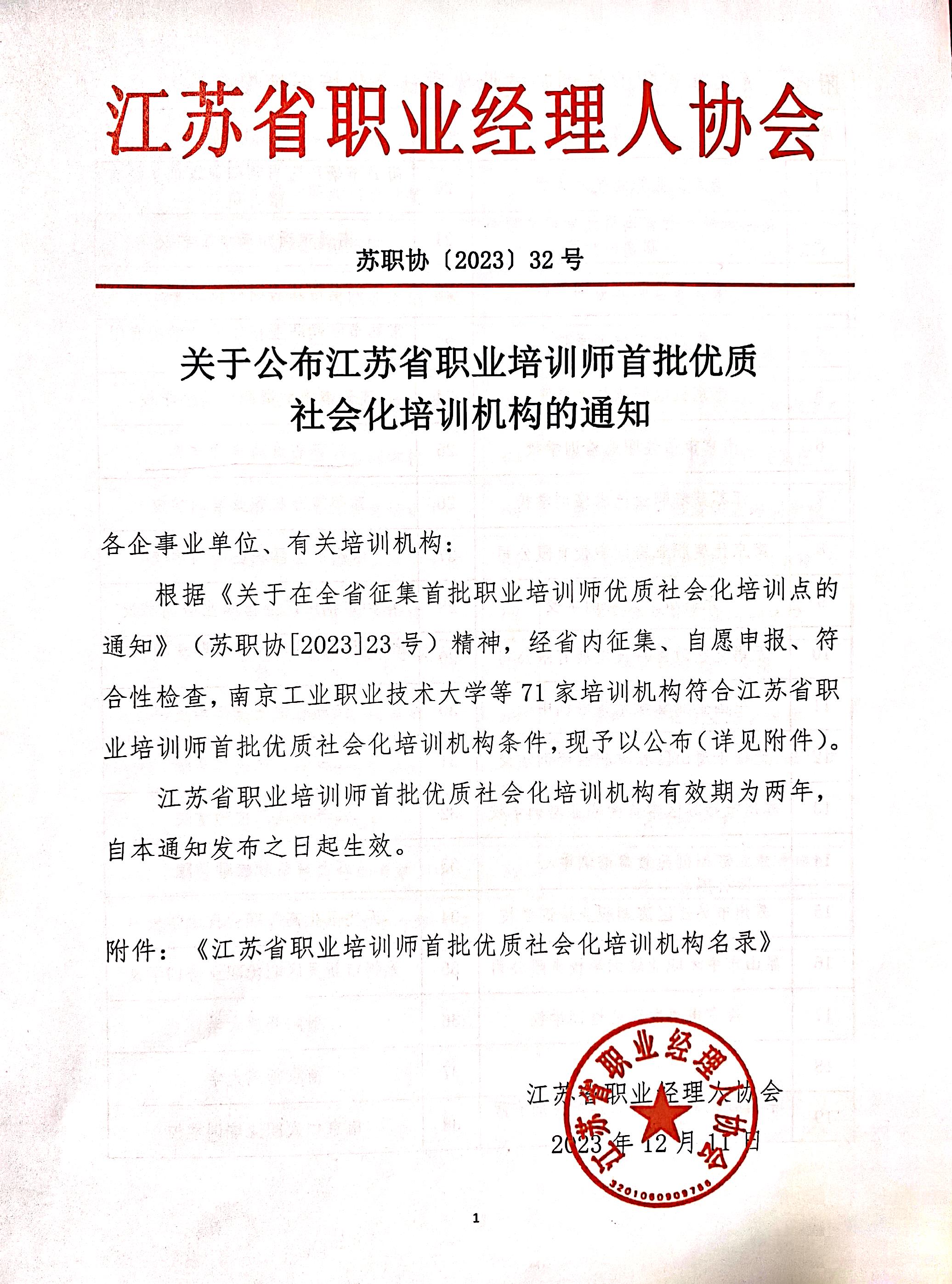 近日,江苏省职业经理人协会发布《关于公布江苏省江苏省职业培训师首批优质社会化培训机构的通知》,我院获批“江苏省职业培训师首批优质社会化培训机构”。