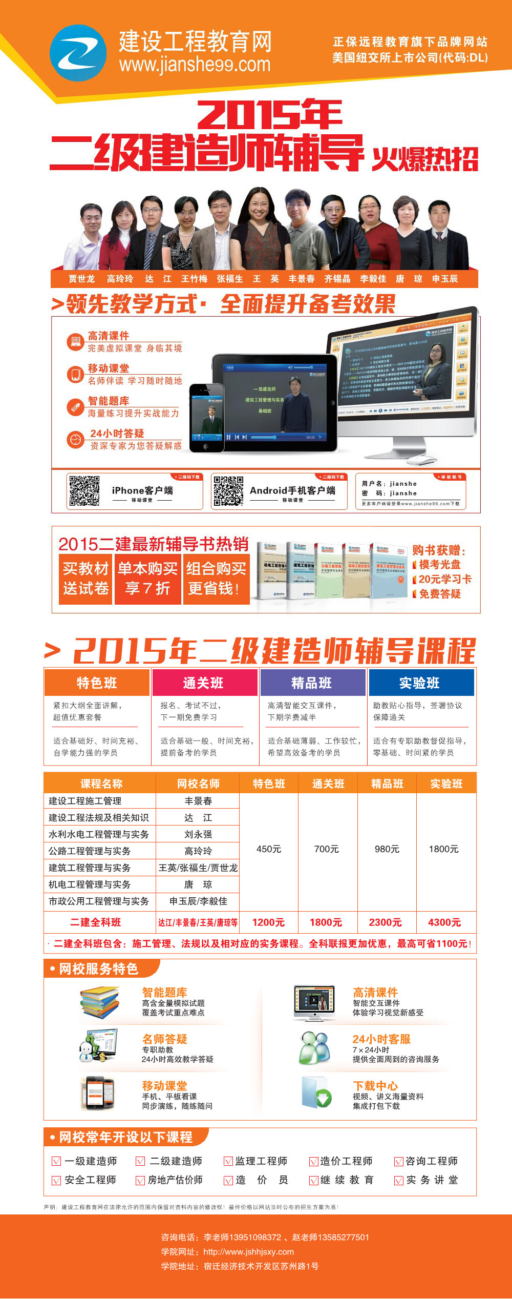 淮海技师学院(政府公办院校、国家级职业培训基地) 与北京正保远程教育集团(中国第一家在美国纽交所上市的远程教育公司、中国十佳网络教育机构)联合举办2015年二级建造师辅导班,现火爆热招!汇聚天下名师,自主建设智能交互式远程教育平台,采用高清视频课件,并支持移动设备看课(苹果,安卓系统APP),让学员不限次数,不限时间,随时随地学习,为学员提供高质量的课程,并辅以24小时在线答疑和客户服务,倾力打造完美的虚拟课堂。要培训就选正规培训机构,领先的教学方式,全面提升备考效果。